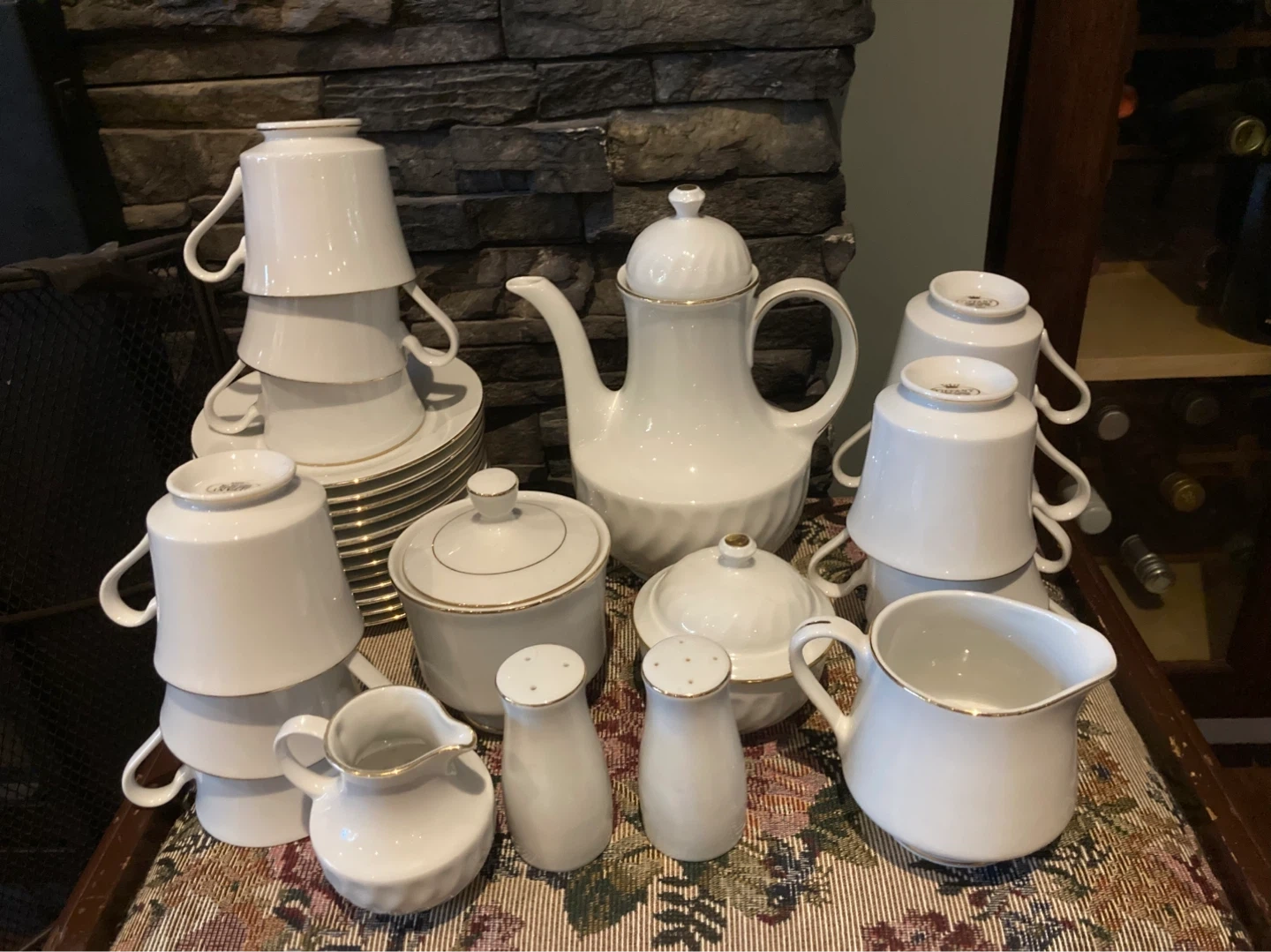 A white porcelain tea set with gold trim. Includes a teapot, creamer, sugar bowl, salt and pepper shakers, and multiple cups and saucers. Made in Japan.