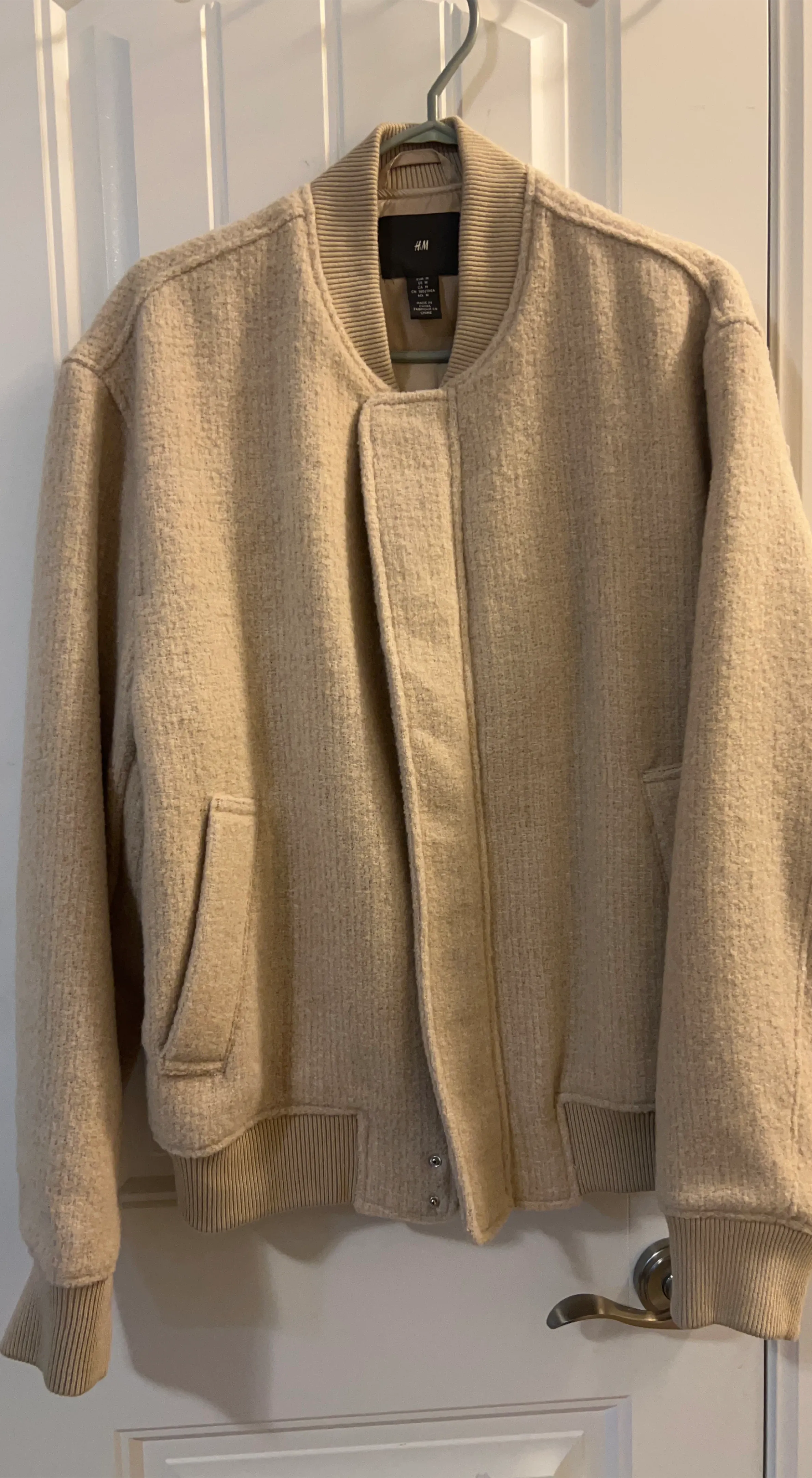 This beige bomber jacket from H&M is a stylish outerwear piece. It's made with a textured fabric and features ribbed cuffs and hem. A great layering option for cooler weather! Never worn