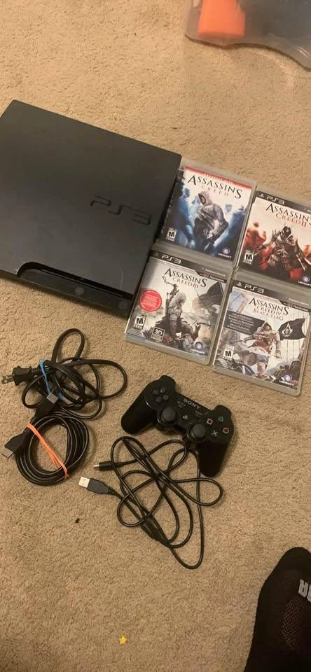 Selling a used Sony PlayStation 3 (PS3) console. Comes with one controller, power and AV cables, and four games: Assassin's Creed, Assassin's Creed II, Assassin's Creed III, and Assassin's Creed Black Flag