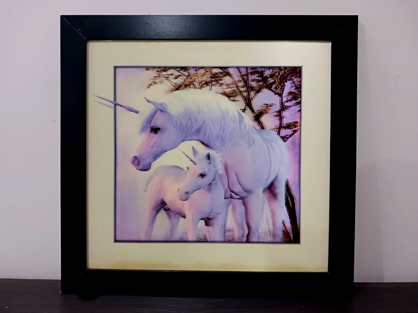 This framed art print features a mother and baby unicorn in a dreamy forest setting. It's framed in a simple black frame, ready to hang. The art's soft colours would add a touch of magic to any room.