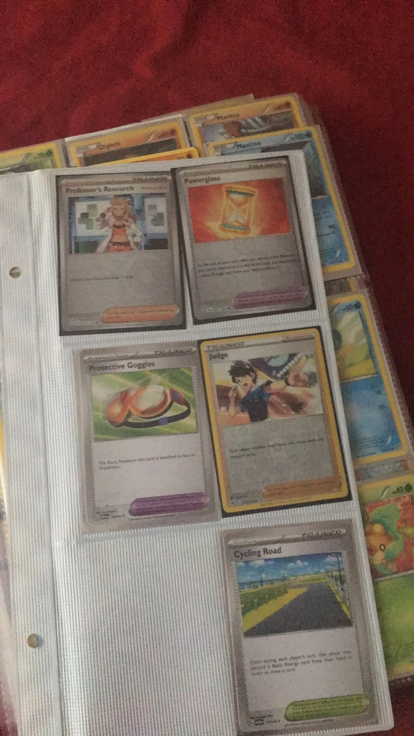 Collection of assorted Pokemon trading cards. Includes trainer cards like Professor's Research, Judge, and Ortega. Also features Pokemon like Pikachu, Eevee, and Gyarados. Cards are kept in a binder.