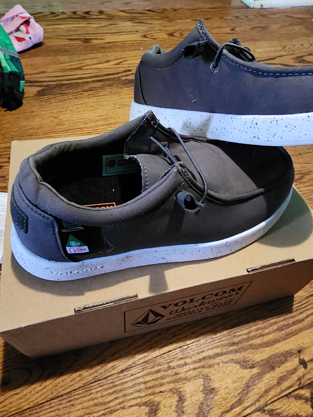 10Selling a pair of Volcom men's worker shoes. They come with the original box. Please note that the size is unknown, so please check the photos carefully to ensure they will fit you. They appear to be in good condition! Only worn once