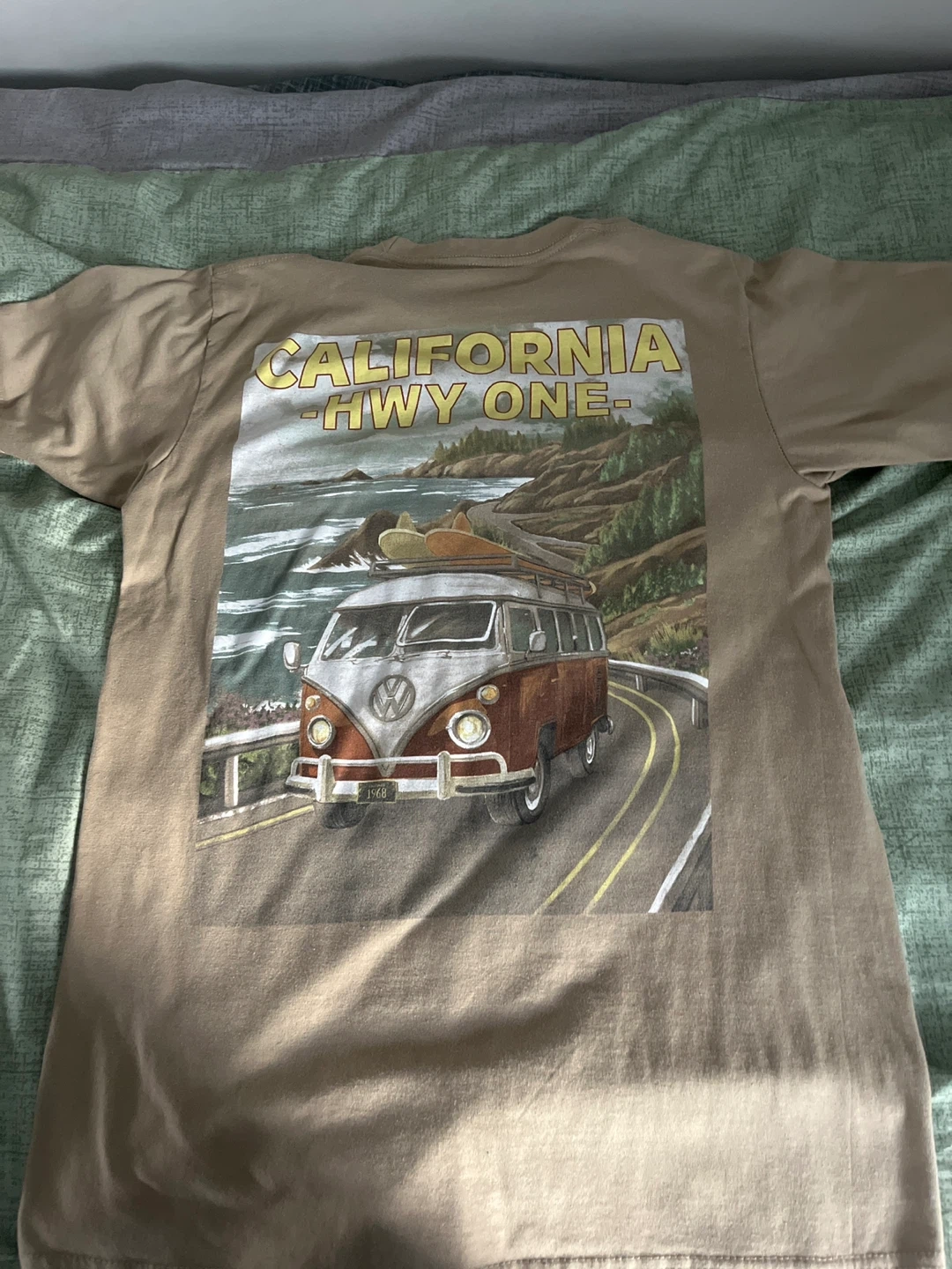 Selling a Volkswagen graphic tee! It features the classic VW logo with 'Take The Bus' printed on the front. The back has a cool design of a VW bus driving on California Highway One. It's a unique and stylish shirt for any VW enthusiast