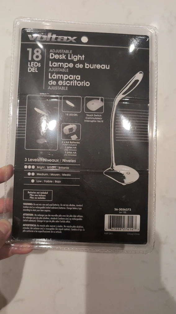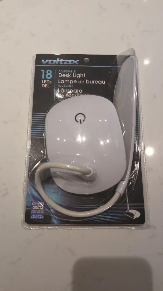 73I'm selling a brand new Voltax adjustable desk lamp still sealed in its original packaging! It features 18 LEDs and has three brightness levels: bright, medium, and low. It also uses 3 AA batteries.