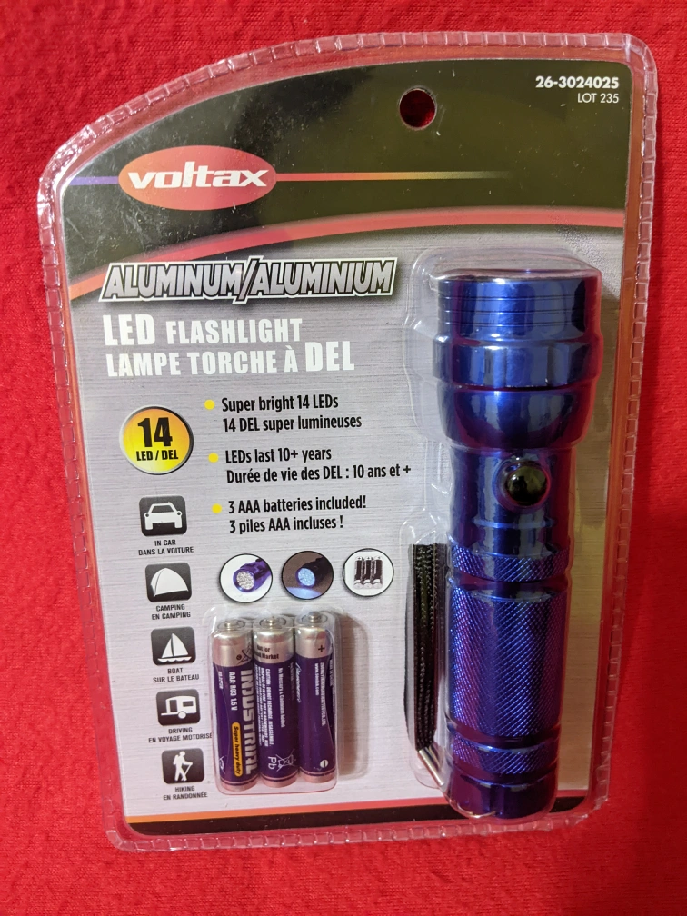 Aluminum LED flashlight. 14 LEDs. Includes 3 AAA batteries. Great for car, camping, boating, driving, and hiking.