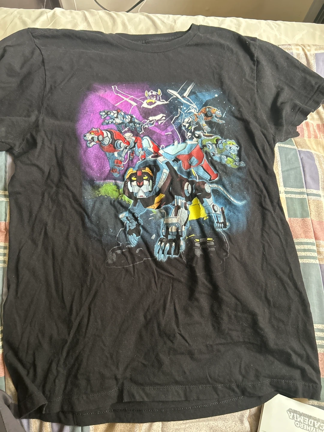 Selling a black Voltron T-shirt. It features a colourful graphic of the Voltron lions and characters. It's in good condition and ready for a new home!