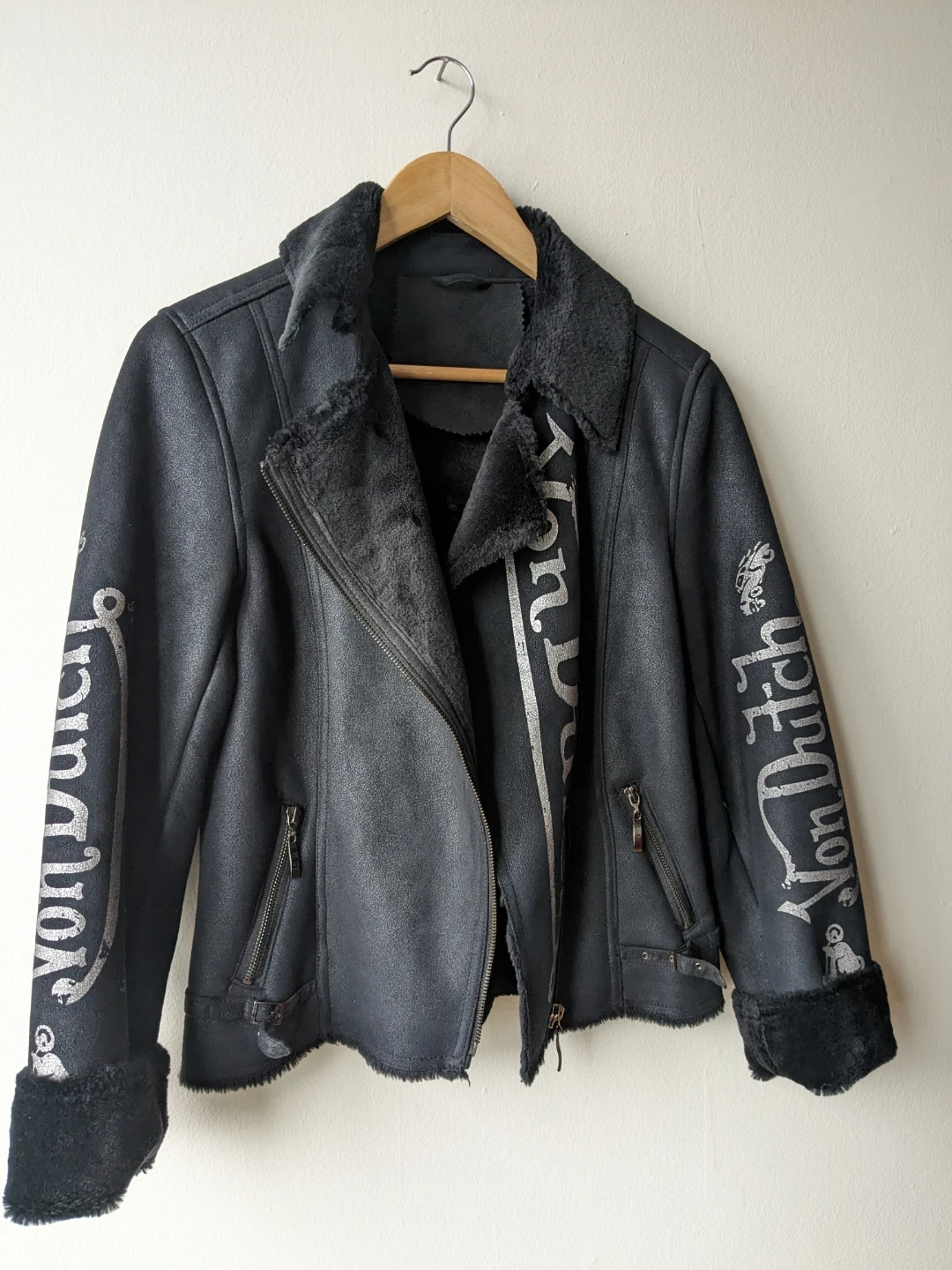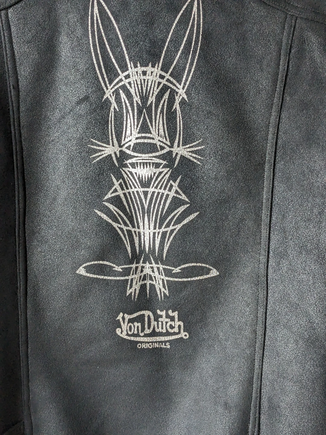 15Cozy Von Dutch jacket in a stylish black faux suede! The front and back are adorned with the brand's logo. It's made with 100% polyester on the front and back, and 100% acrylic.