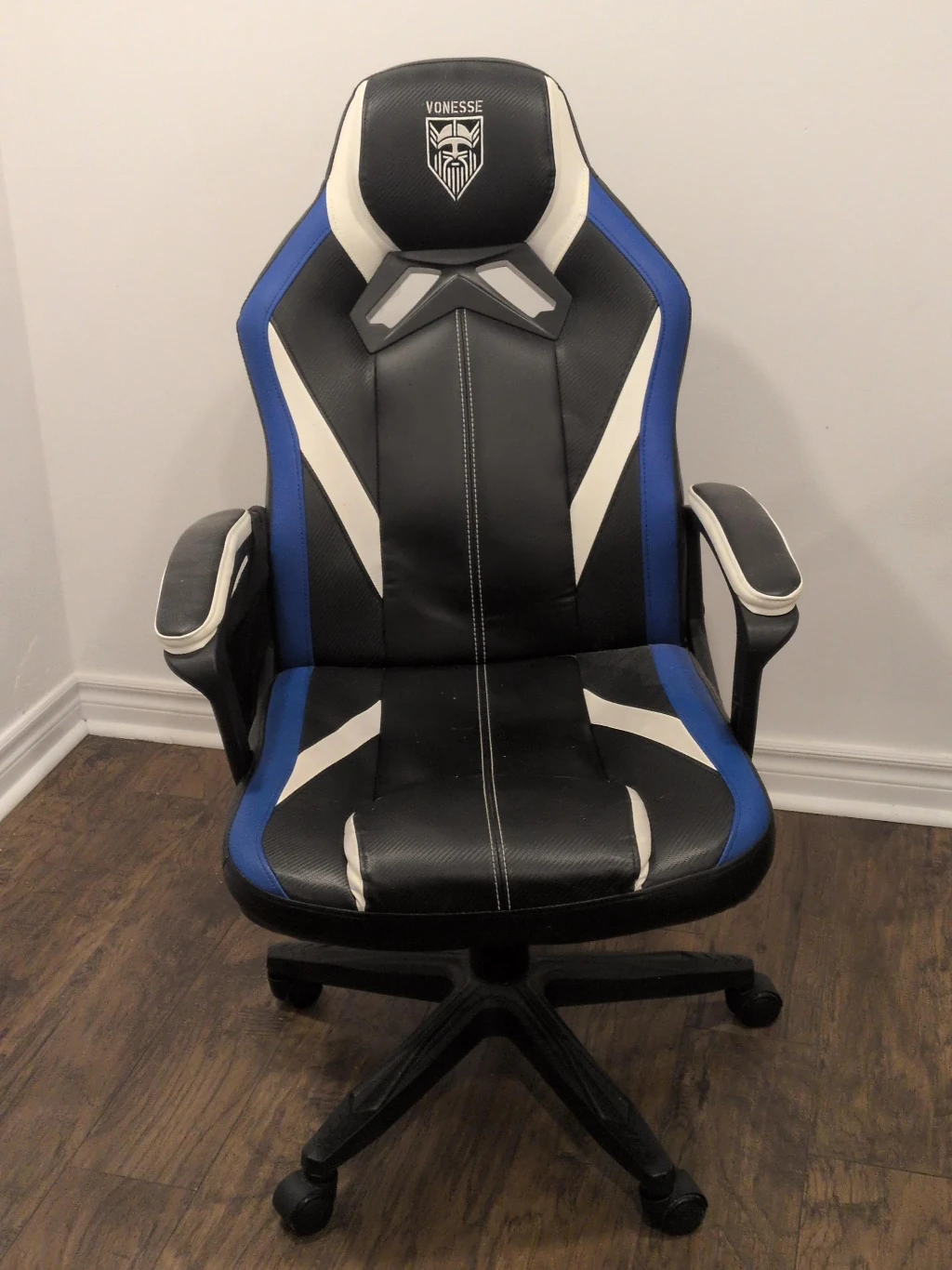 15Selling a Vonesse gaming chair in black, blue, and white. It's in used condition, showing some signs of wear, but still very functional and comfortable for long gaming sessions or working from home.