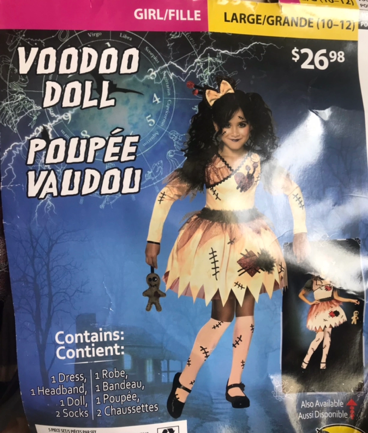 76Get ready for Halloween with this adorable Voodoo Doll costume! It's a girl's size Large (10-12) and includes everything you need to complete the look: a dress, robe, headband, doll, and socks. Originally bought for $26.98. Brand new.