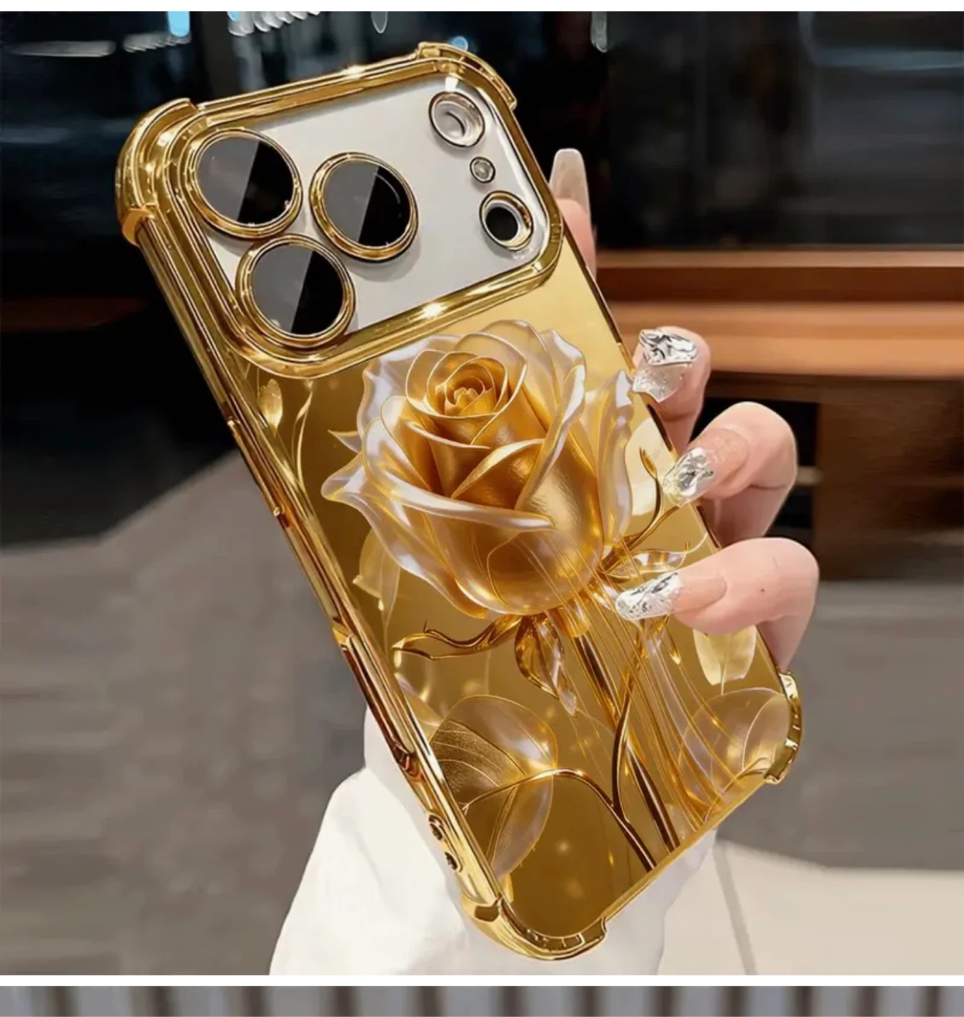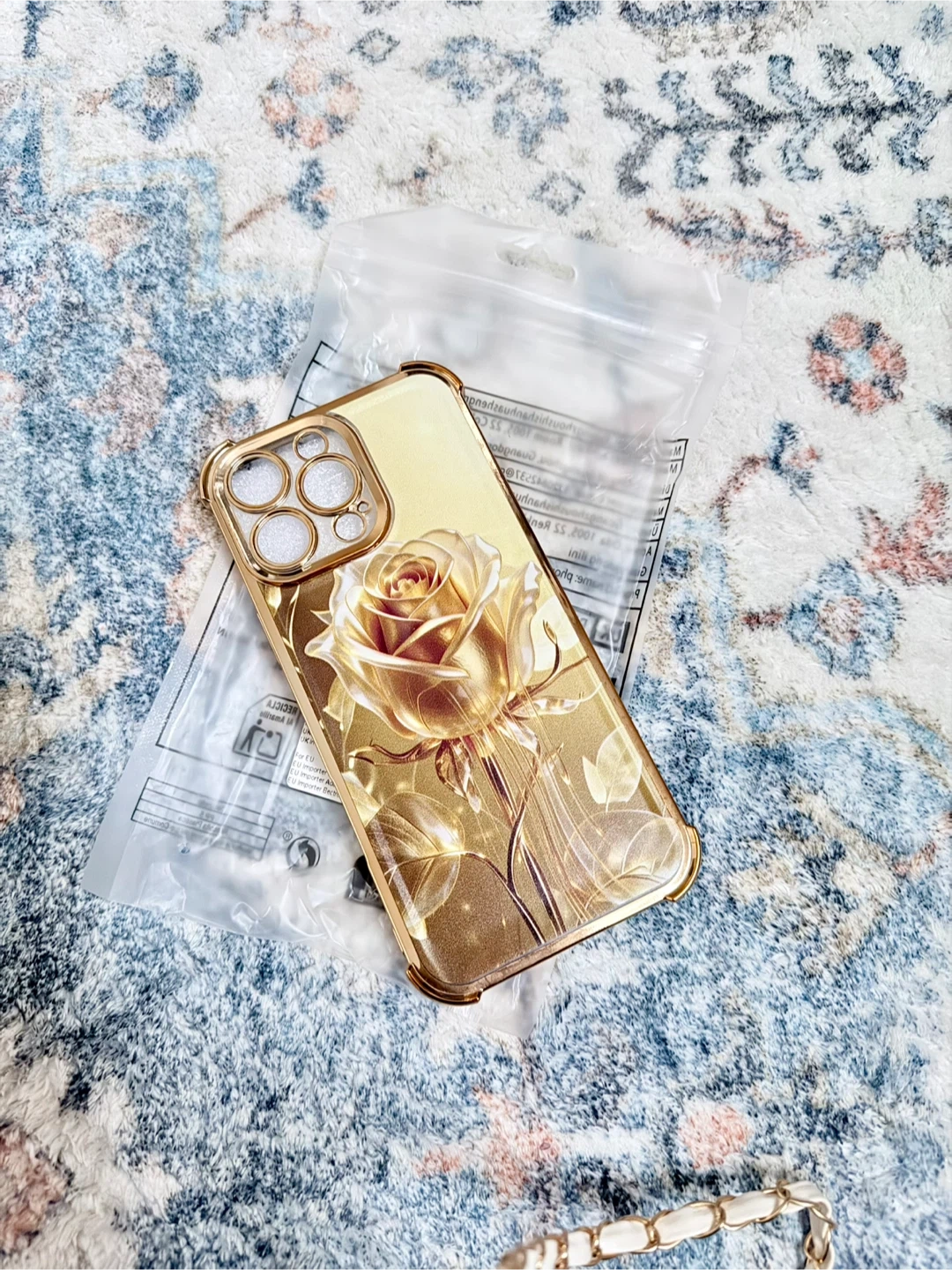 This phone case features a beautiful 3D gold rose design with a metallic gold finish. It's made with durable materials to protect your phone. This case offers a stylish way to guard your device!