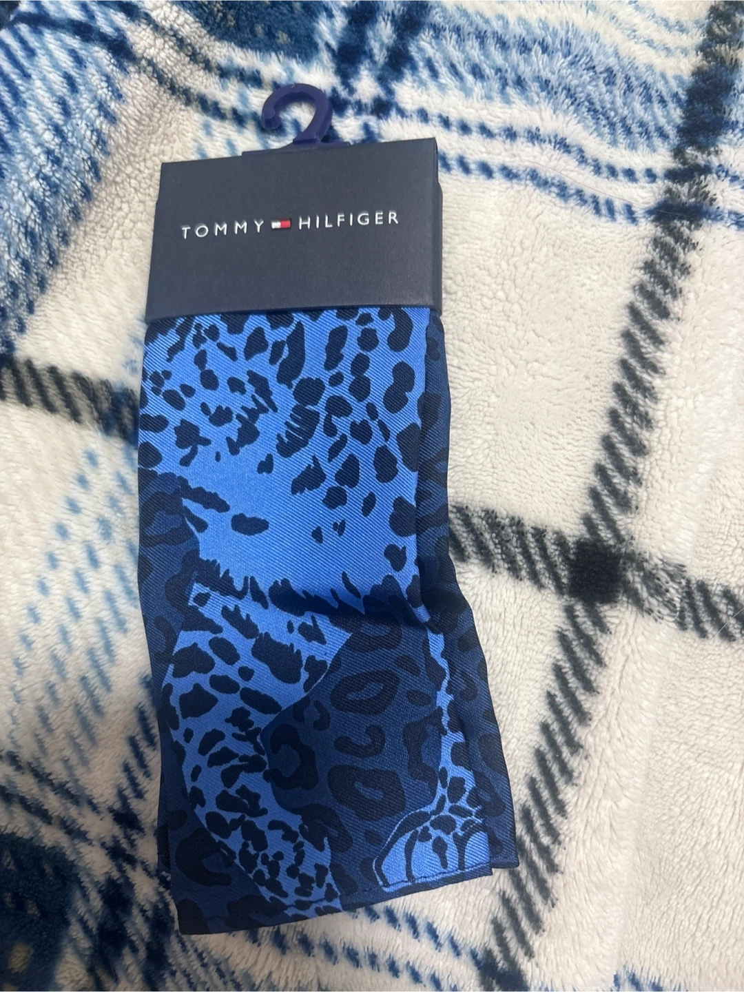 Brand new Tommy Hilfiger scarf with a stylish blue leopard print. It's made from a smooth fabric. This accessory adds a pop of colour and pattern to any outfit! Pick up cash only