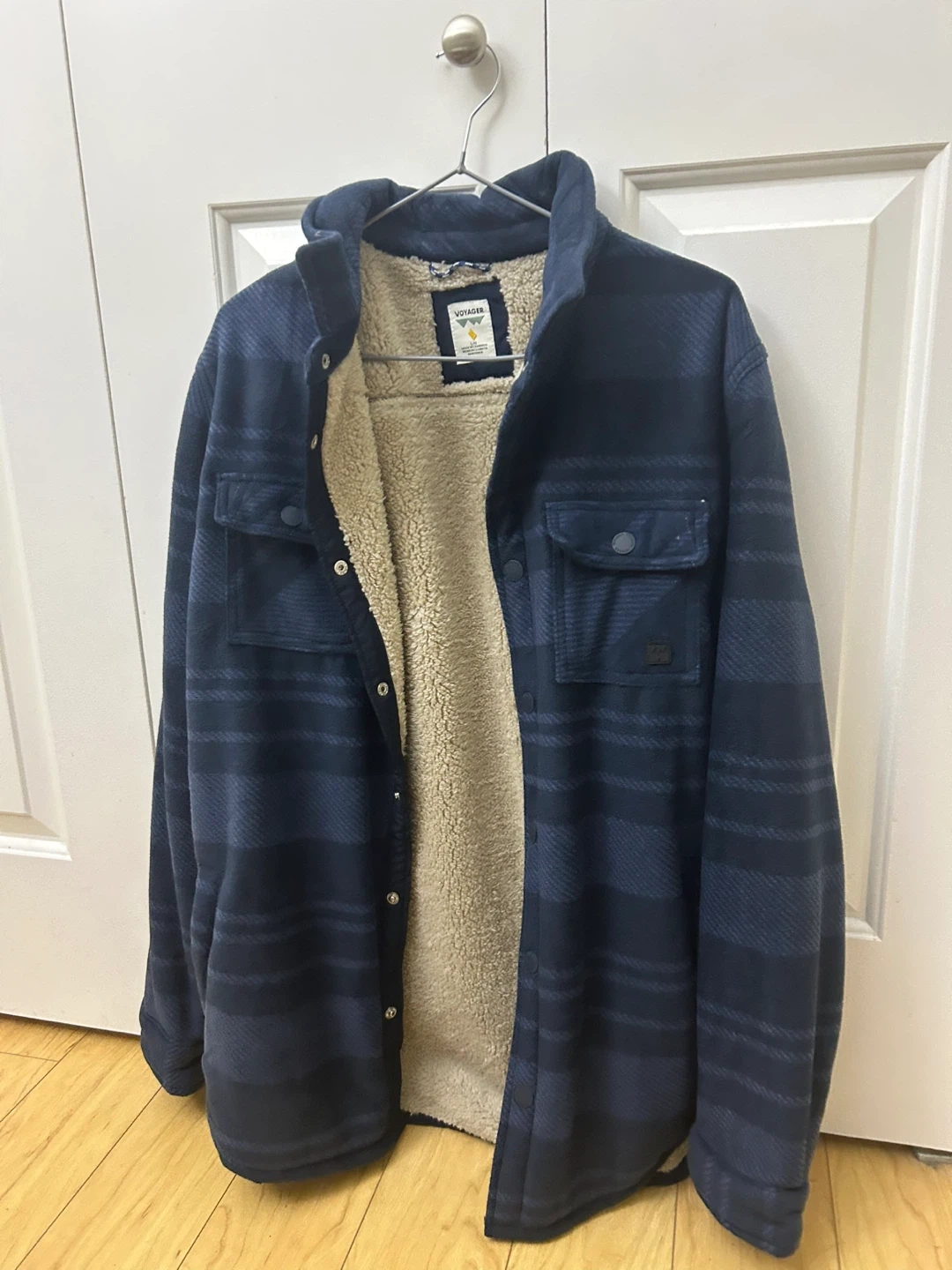 10Cozy up with this Voyager shirt jacket! It features a blue plaid pattern and a warm sherpa lining, perfect for those chilly days. It's in great condition and ready for a new home. Size large