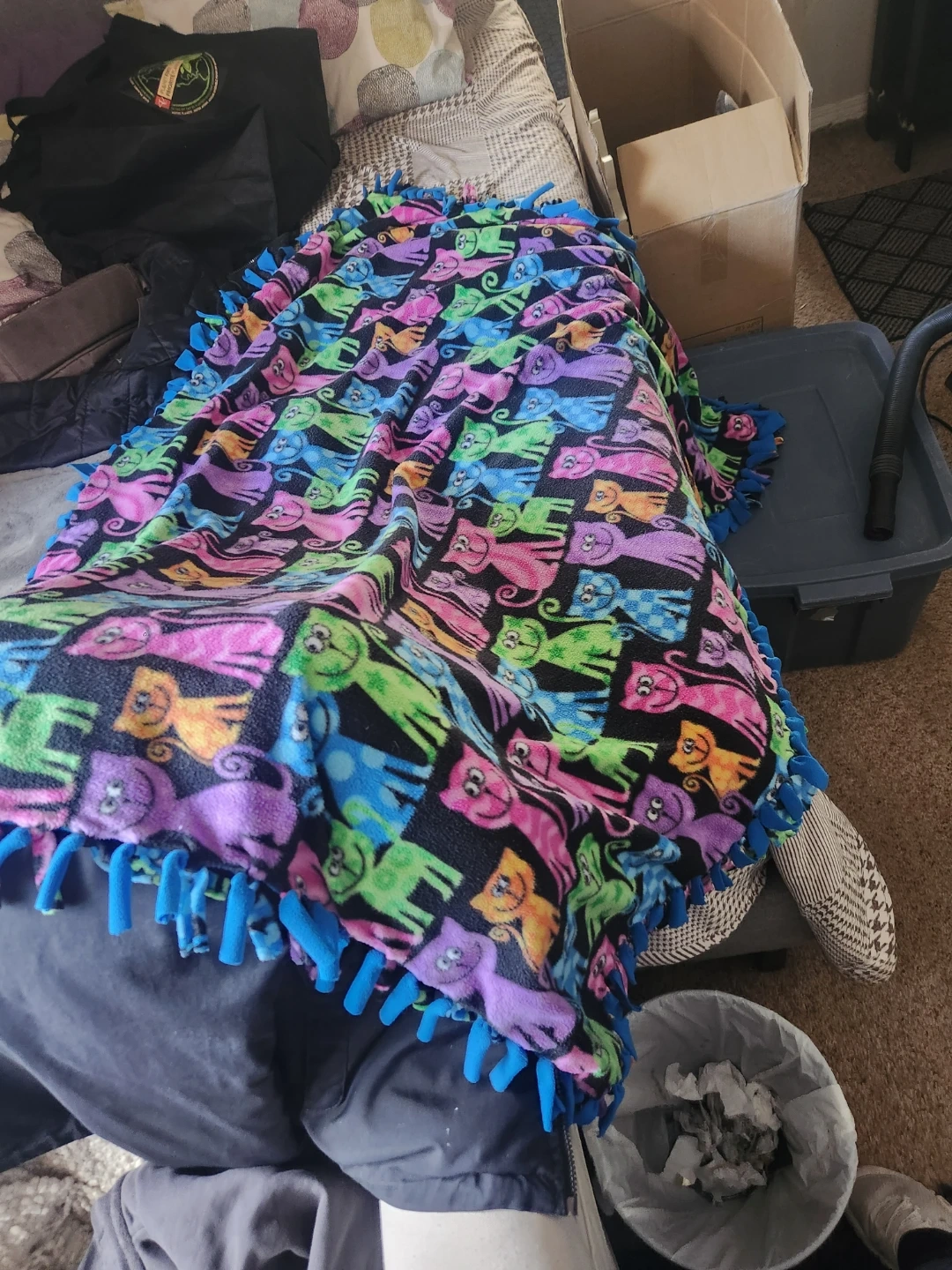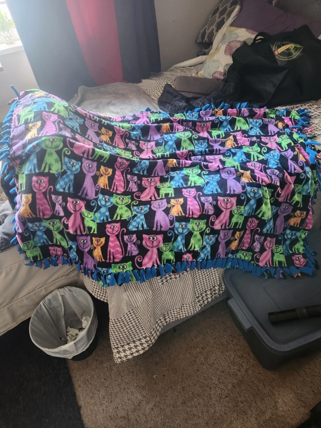 Cozy tie blanket featuring a fun pattern of colourful cats on a black background. It's made of soft fleece material and has blue fringe accents. This blanket is perfect for snuggling on the couch!