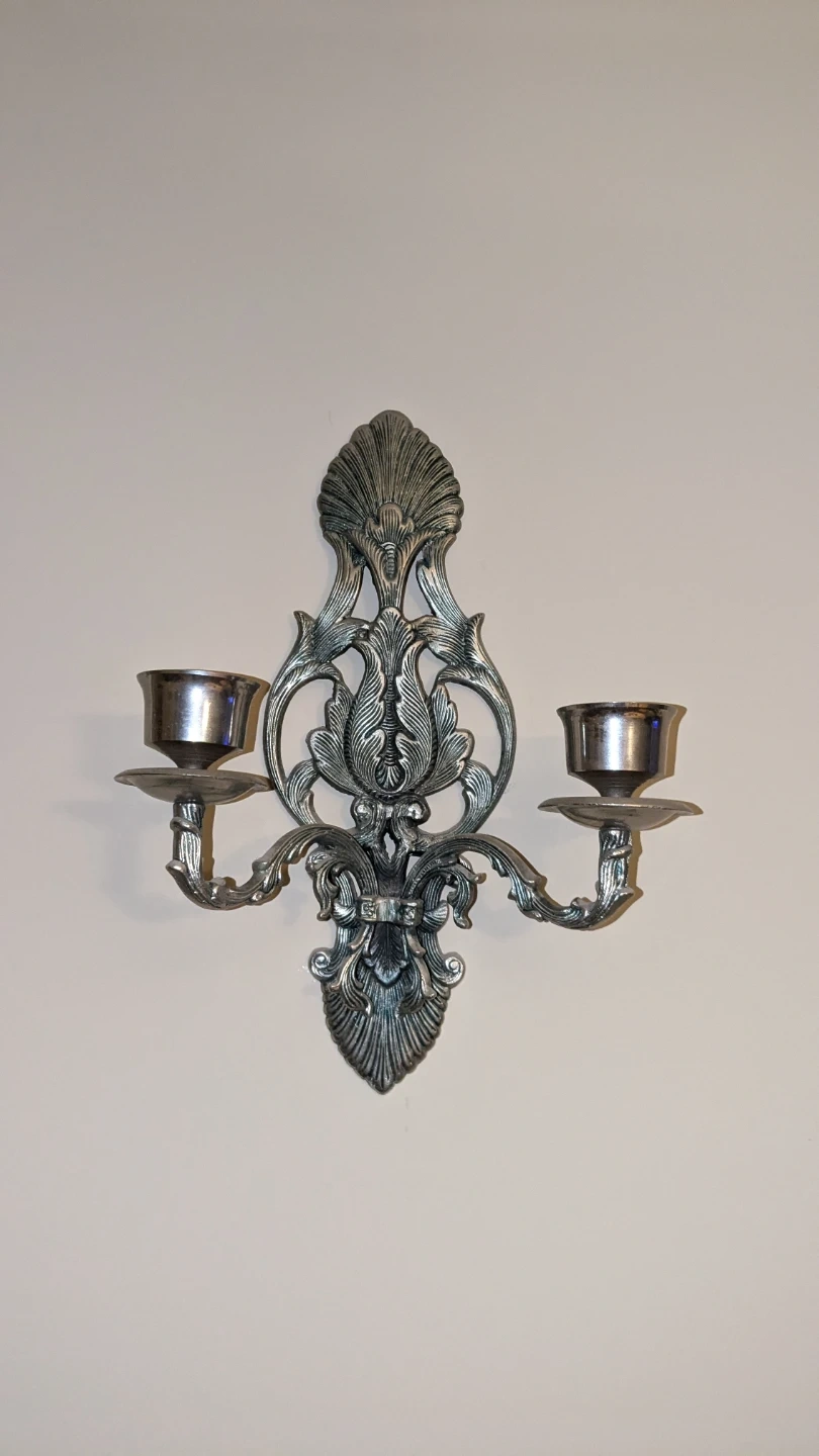 This wall sconce holds two candles and features an ornate, vintage-inspired design. It's made of a silver-toned metal with intricate detailing. It's perfect for adding a touch of classic elegance to any room!