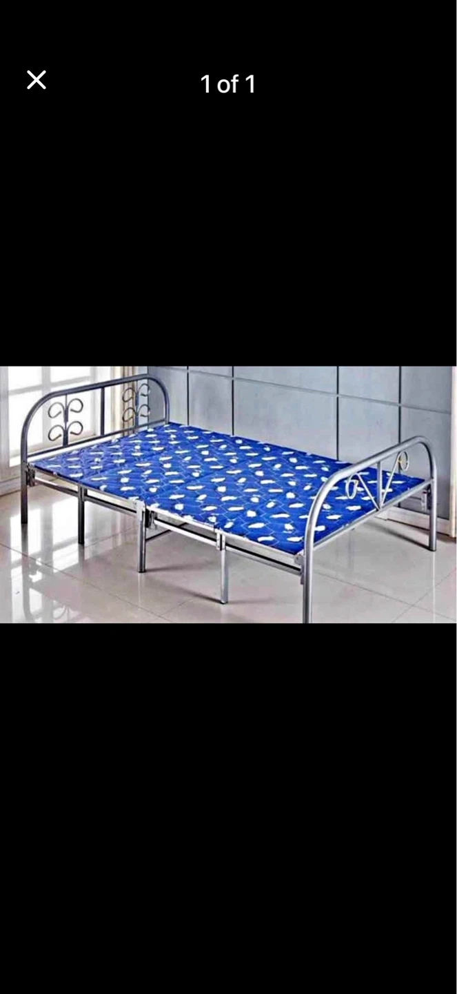 This is a single metal frame folding bed. It comes with a blue mattress featuring a white pattern. It's a convenient option for extra sleeping space. Bed frame is metal.