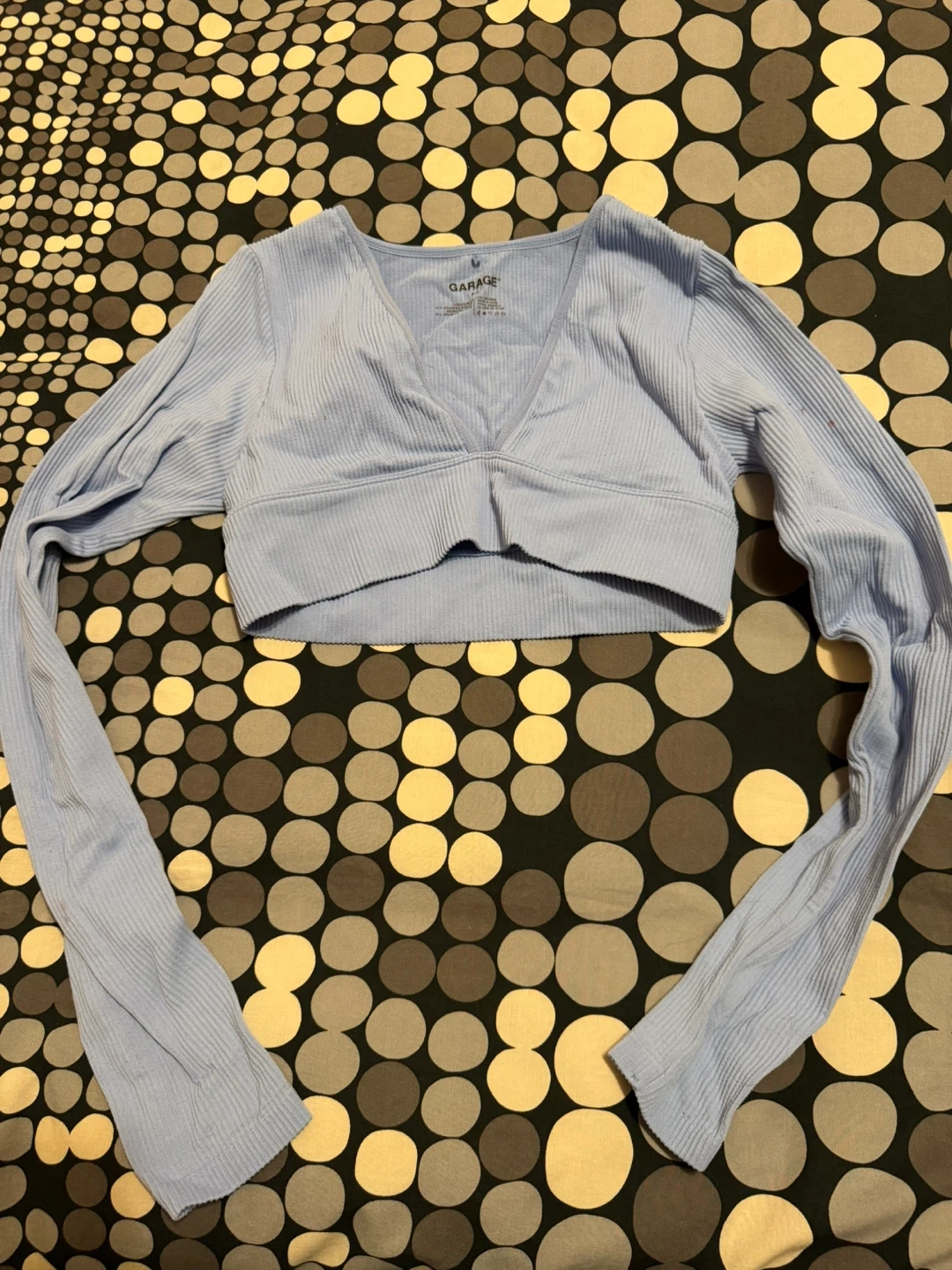 This Garage long sleeve crop top is a light blue colour. It's made of a ribbed material. There are few small stains! ๐