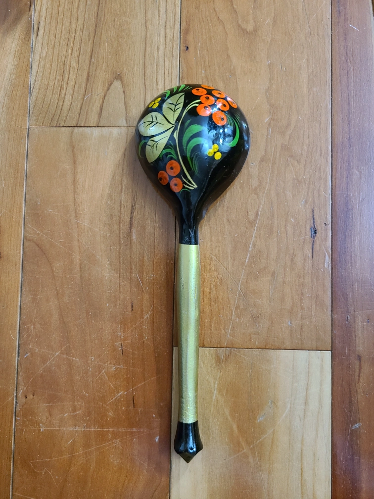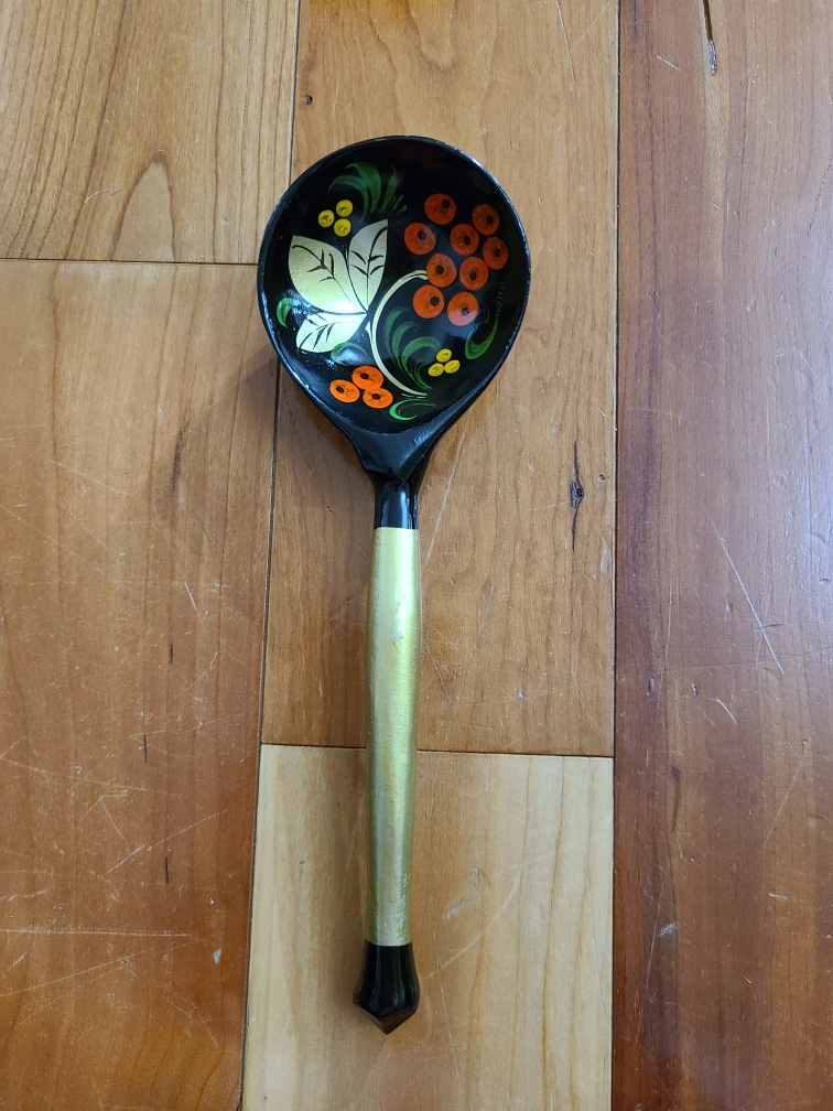 Unique hand-painted wooden spoon. Black base with gold and red accents. Floral design. Could be used for serving or decoration. Excellent condition.