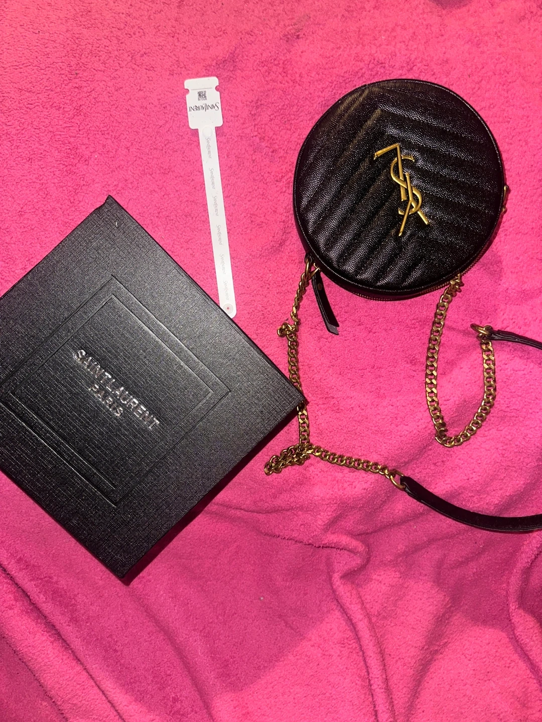 This is a Saint Laurent black quilted leather round bag. It features a gold-tone YSL logo and a gold-tone chain strap. Includes original box and dust bag.
