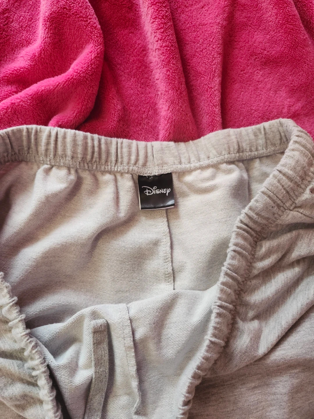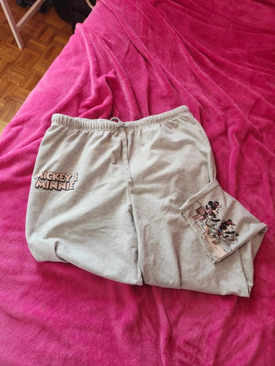 Comfy grey sweatpants featuring Disney's Mickey and Minnie Mouse graphics. Elastic waistband with a drawstring. Made from a soft, mid-weight fabric. Perfect for casual wear!