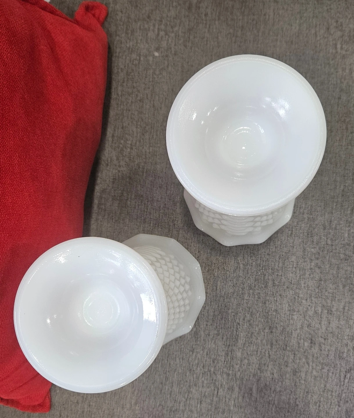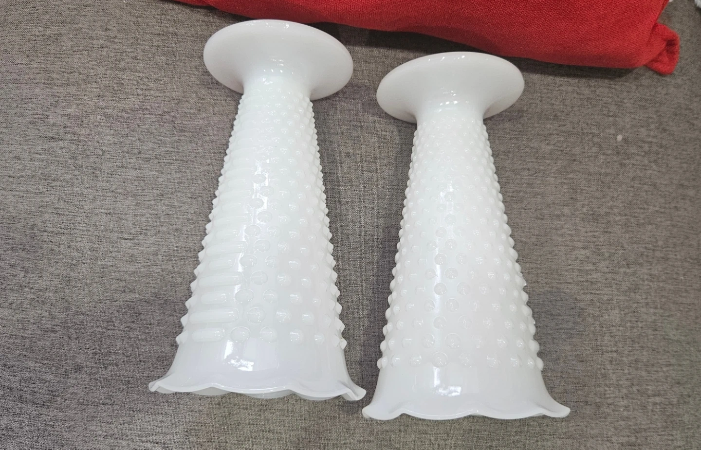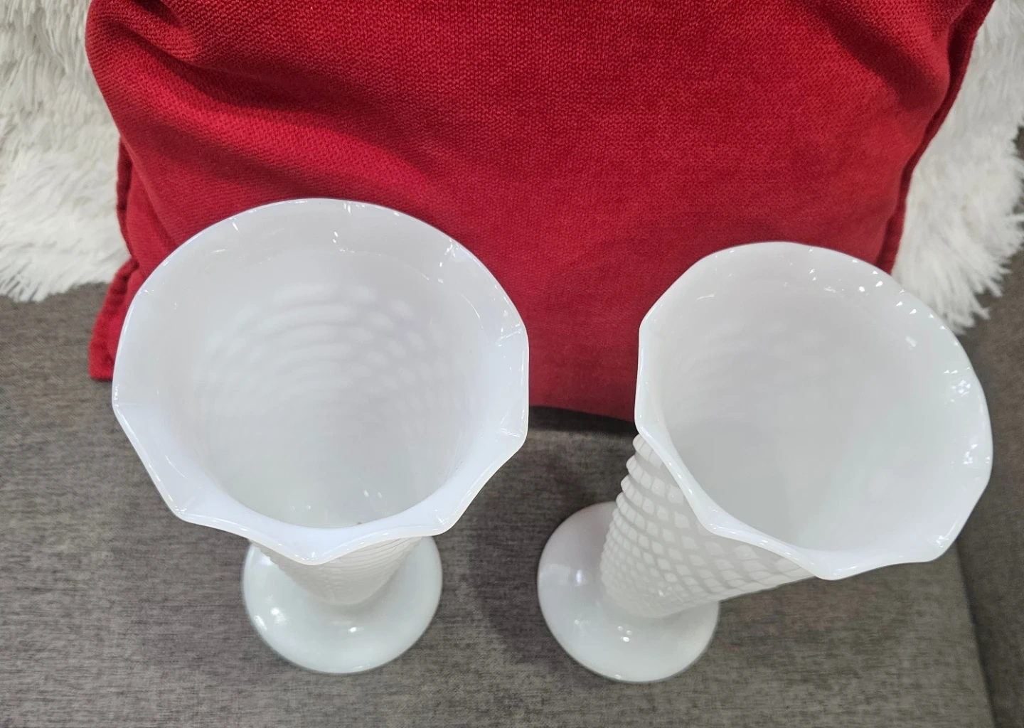 Two white hobnail milk glass vases with ruffled rims. One vase measures approximately 8.5 inches tall, and the other is about 9 inches tall. These decorative pieces would add a vintage touch to any room.