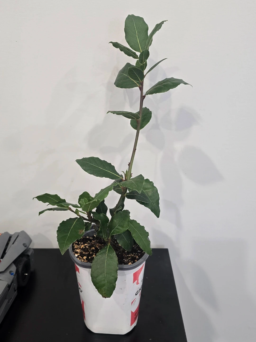 This is a bay laurel plant in a pot. It's great for growing your own culinary herbs. The plant has green leaves and a sturdy stem.