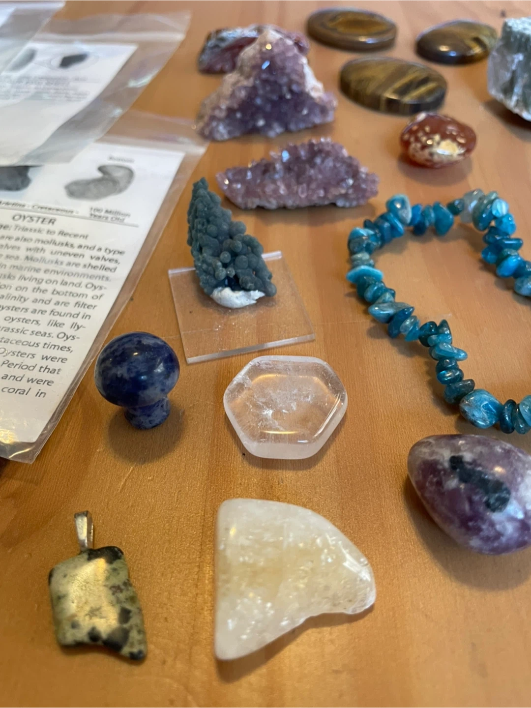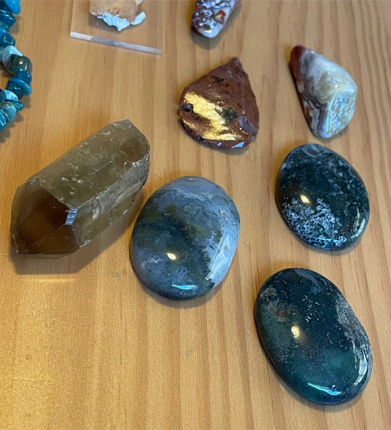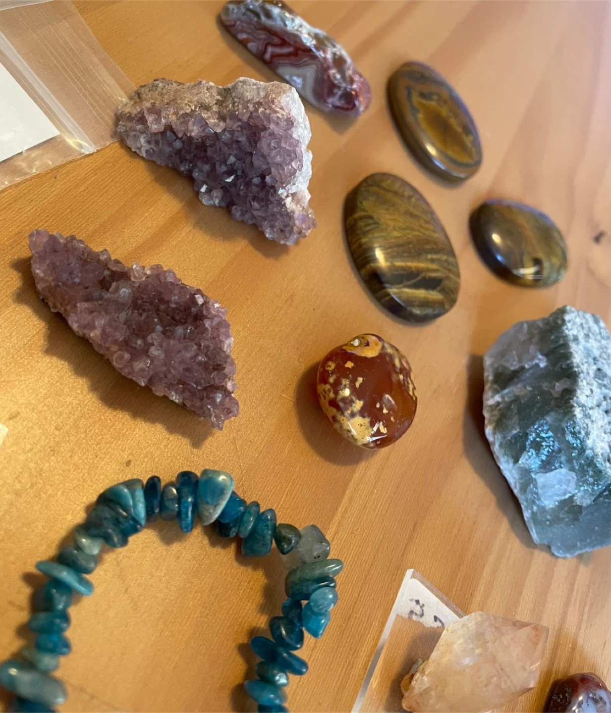 Some of the crystals: Smoky and tangerine quartz, Alacam amethyst, moss agate and tiger palms, sodalite mushroom, blue Tara quartz, and a grape agate specimen.