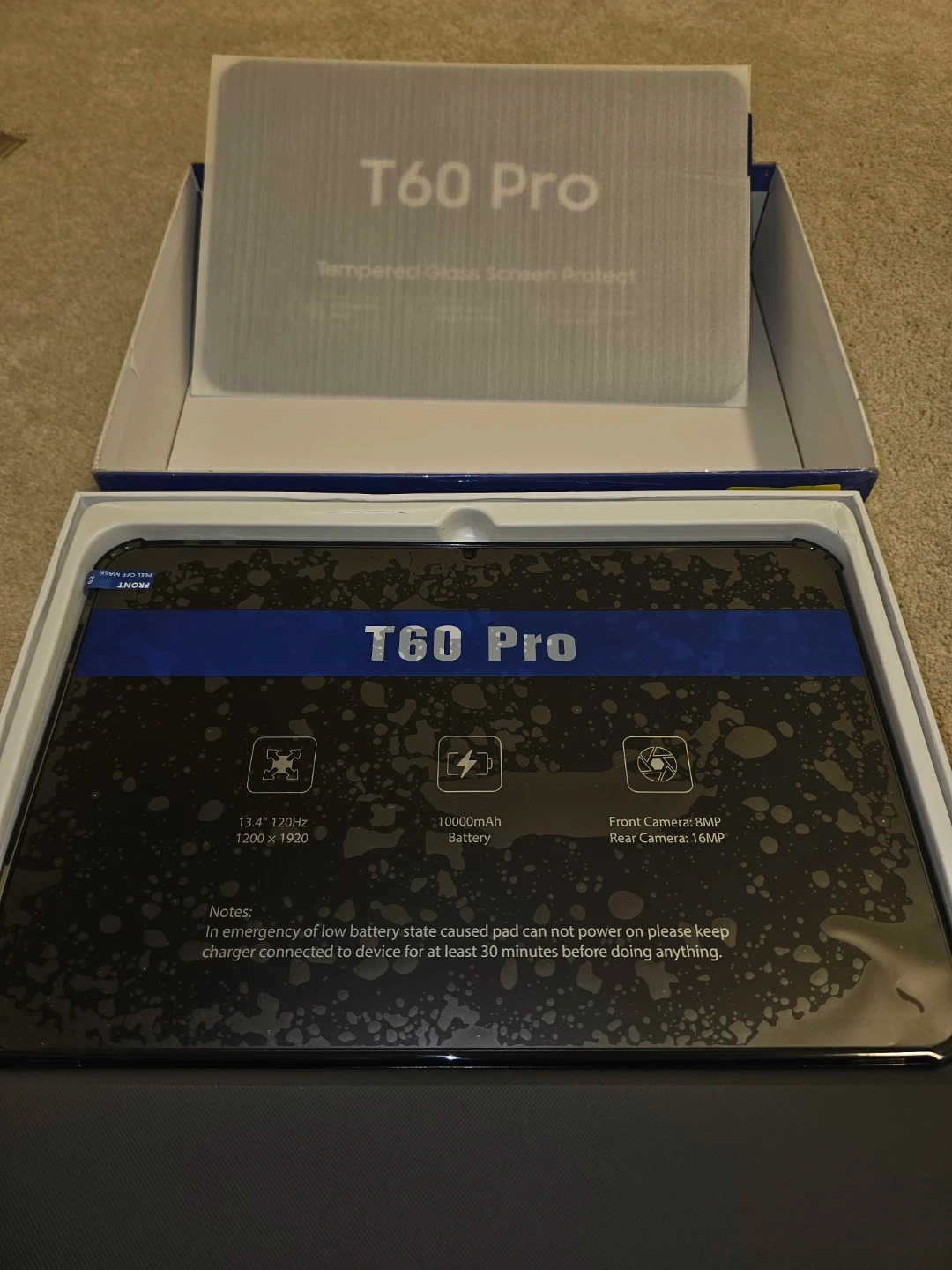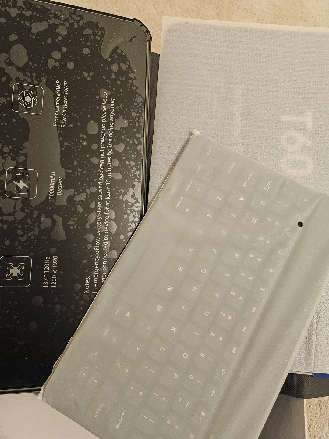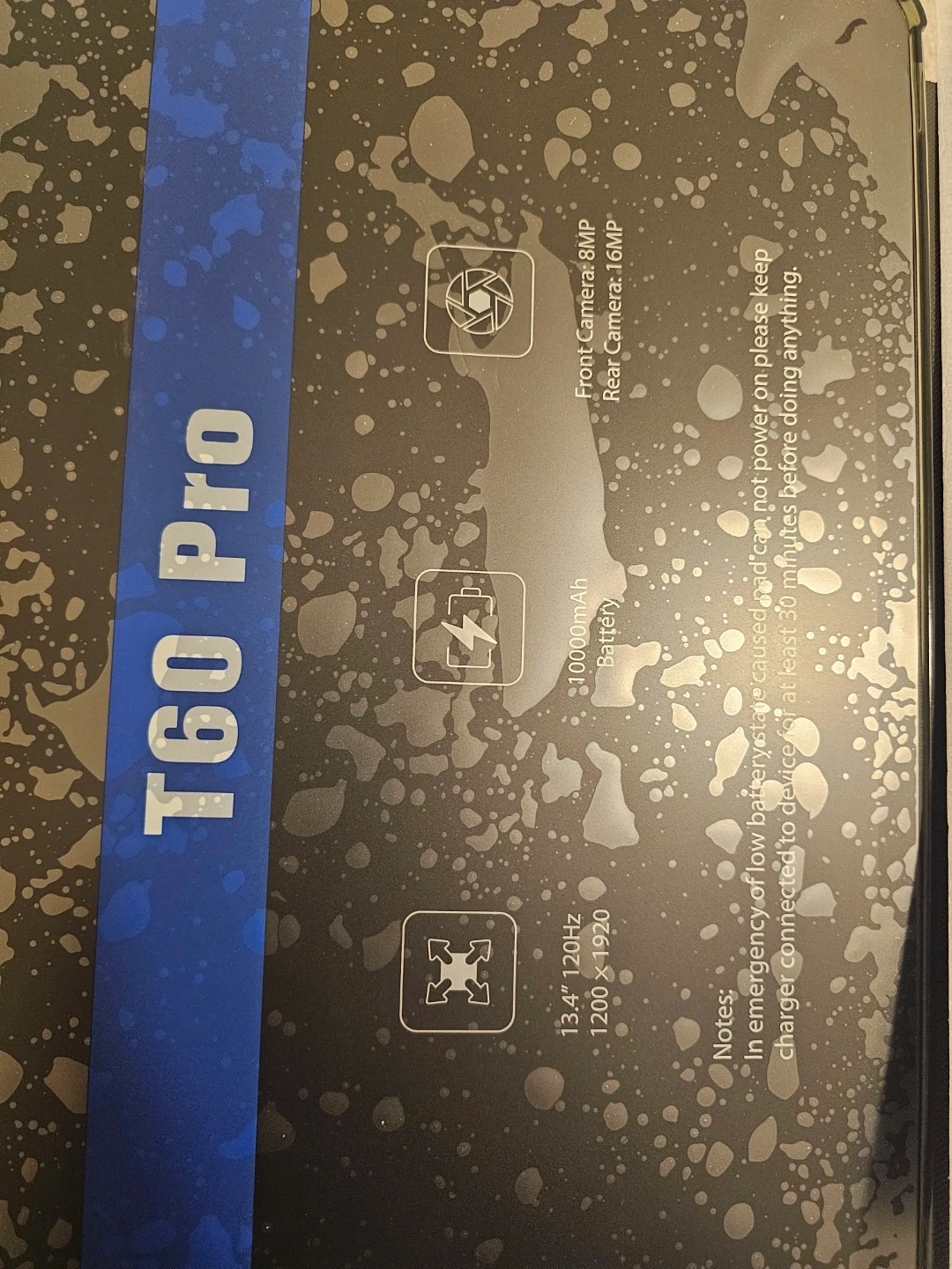 This T60 Pro tablet comes with a 13.4" screen and 120Hz refresh rate. It's powered by a 10000mAh battery and has an 8MP front camera and 16MP rear camera. The package includes a keyboard, mouse, stylus, charger, and earphones.