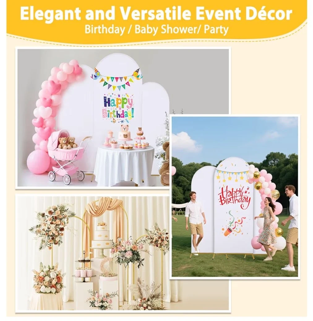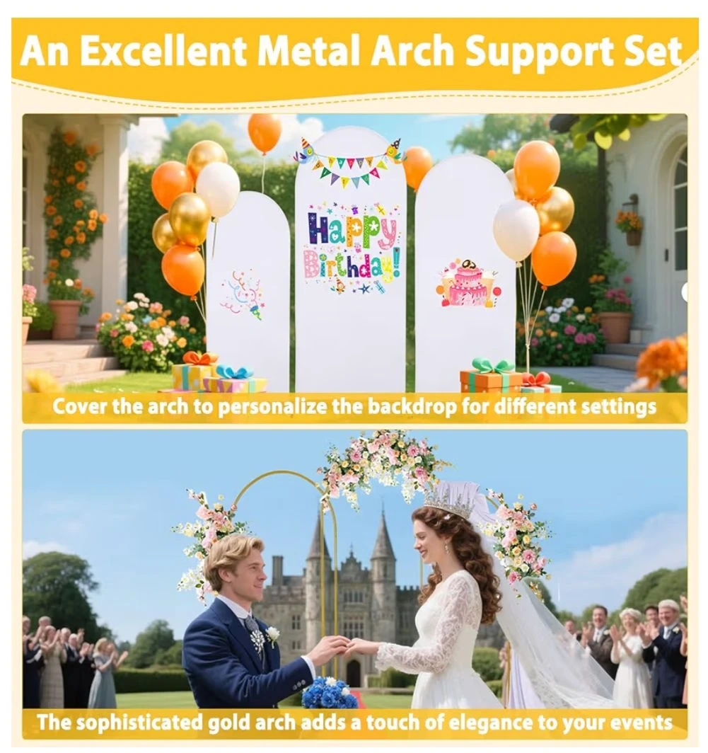 - 3 Metal Arches (Gold): Heights of 7.2ft, 6.6ft, and 6ft.