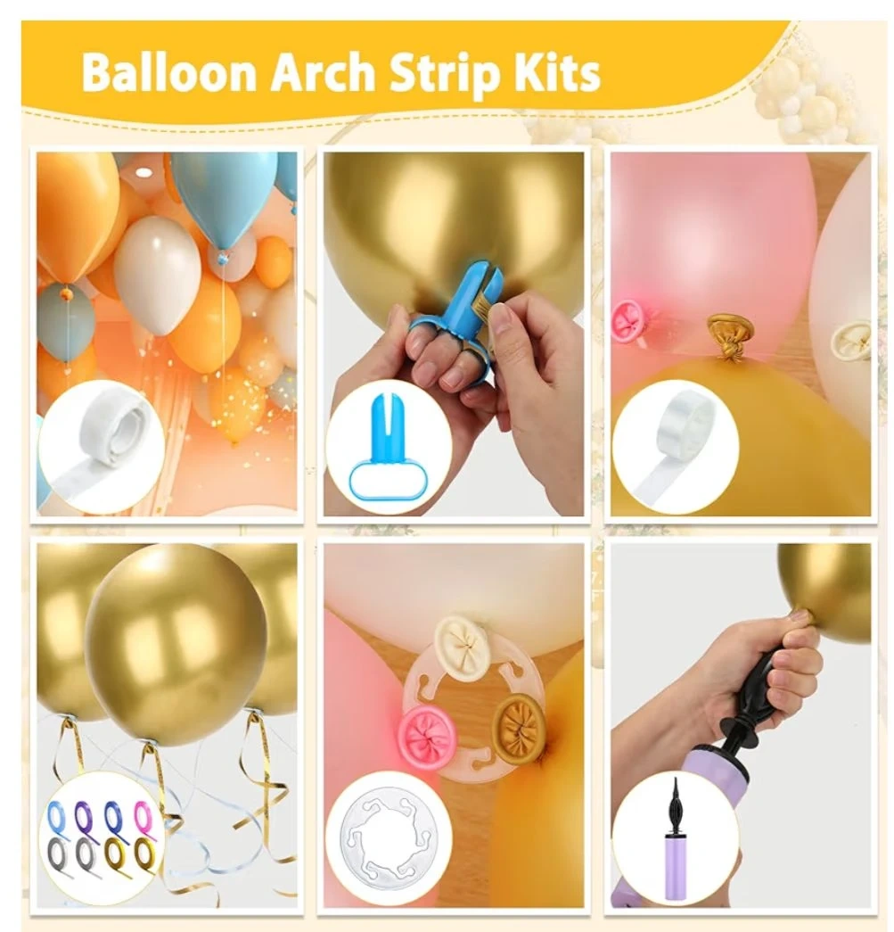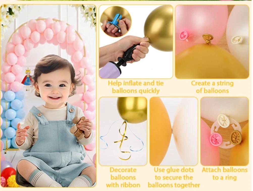 - Balloon Accessories: Includes a pump, 60 reusable clips, ribbon, glue dots, and a knotter.