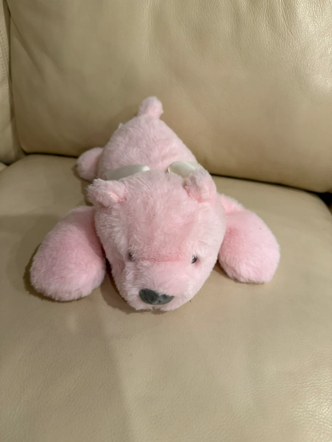 A soft pink stuffed dog toy. It has a satin ribbon tied around its neck. This plush animal is perfect for cuddling or playtime!