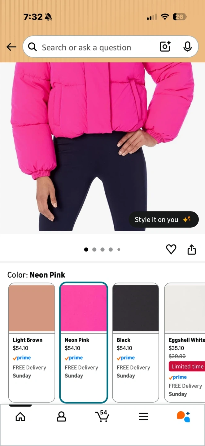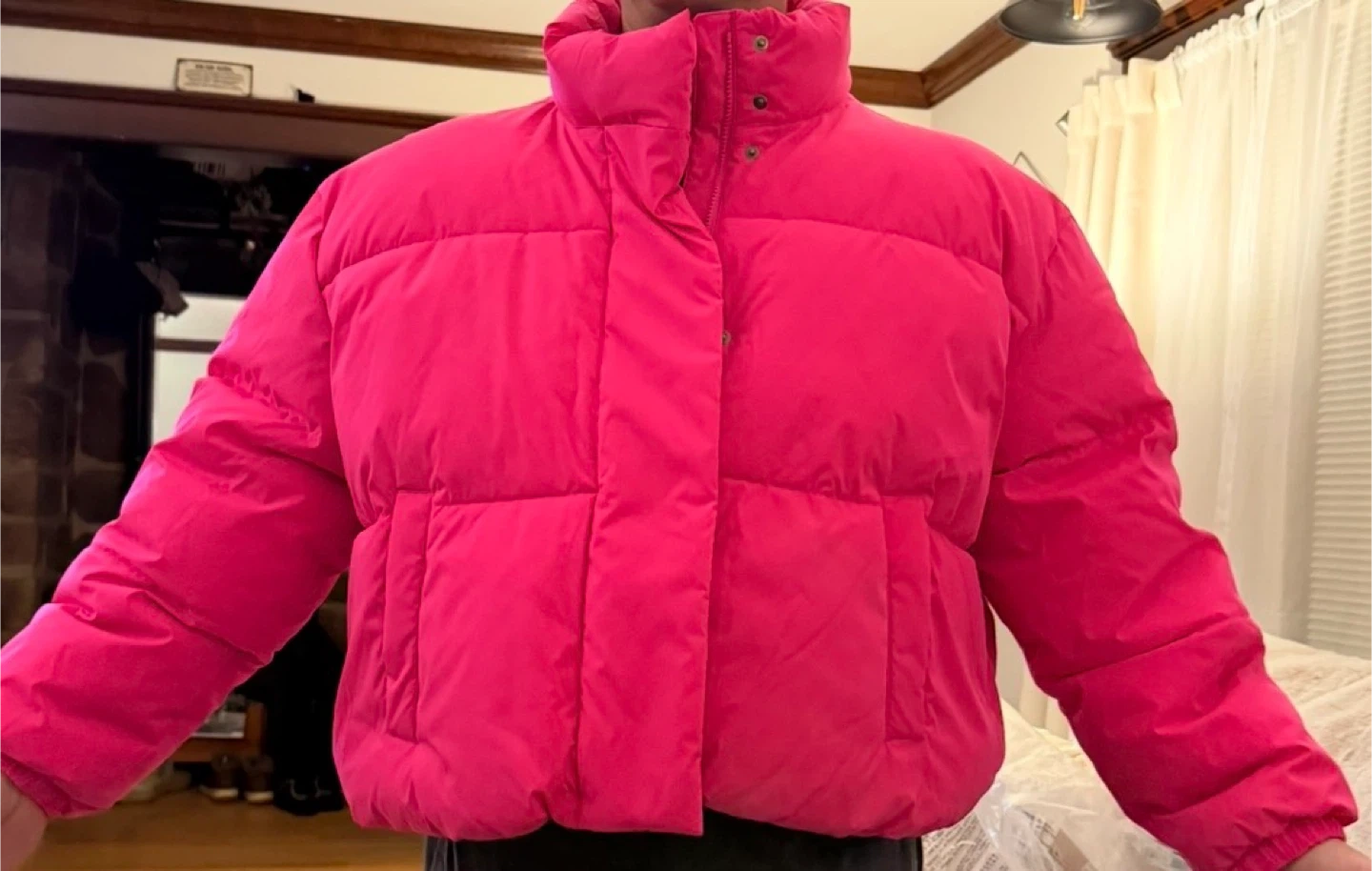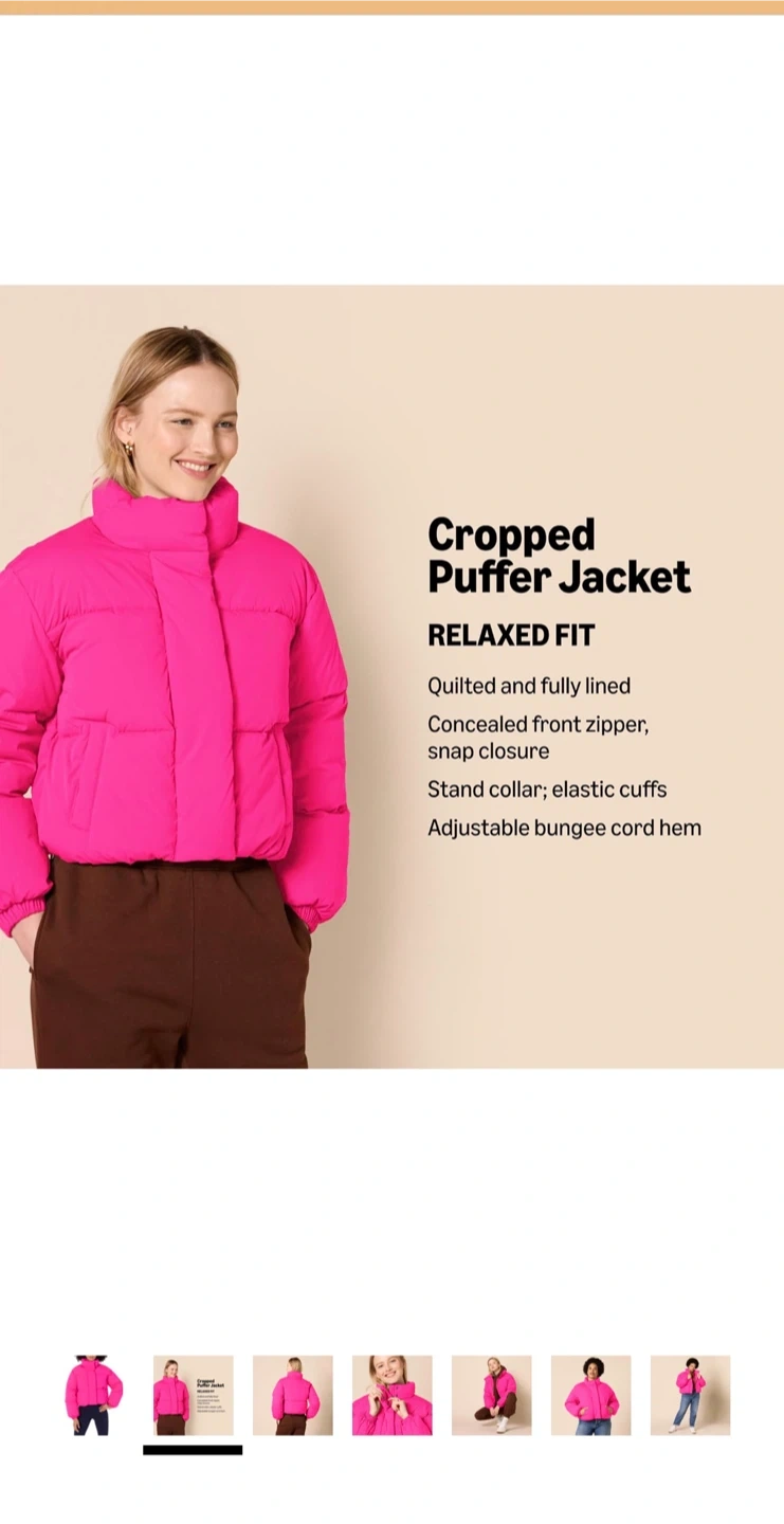 This is an Amazon Essentials cropped puffer jacket in neon pink. It's quilted and fully lined with a concealed front zipper and snap closure. The jacket features elastic cuffs and an adjustable bungee cord hem. Stand collar adds extra warmth.