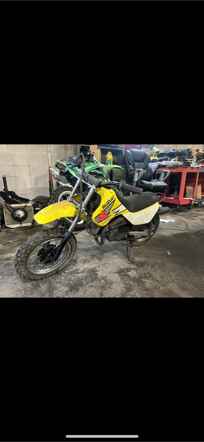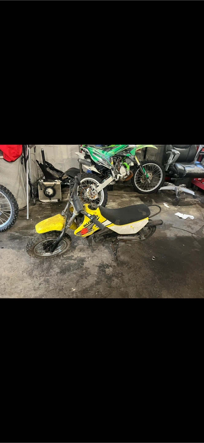 This is a yellow Suzuki JR50 dirt bike. It's a great starter bike for young riders! Comes with two-stroke engine and kick-start.