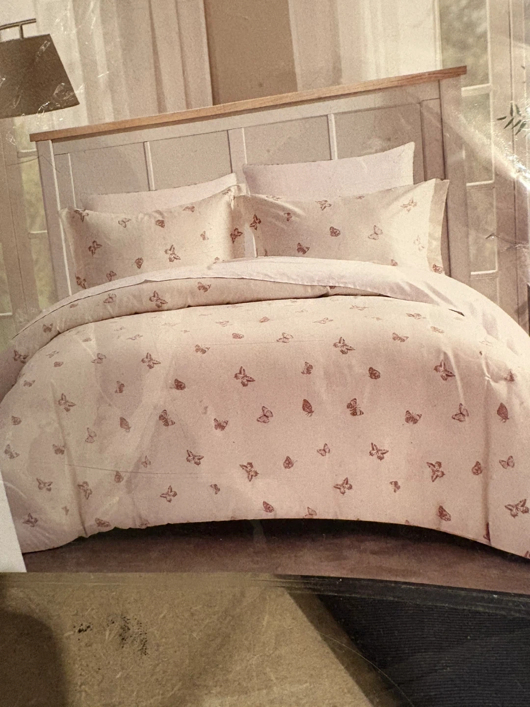 This is a king-sized comforter and two sham set. It features a delicate butterfly pattern all over. The material is soft and comfortable for a cozy bedroom.