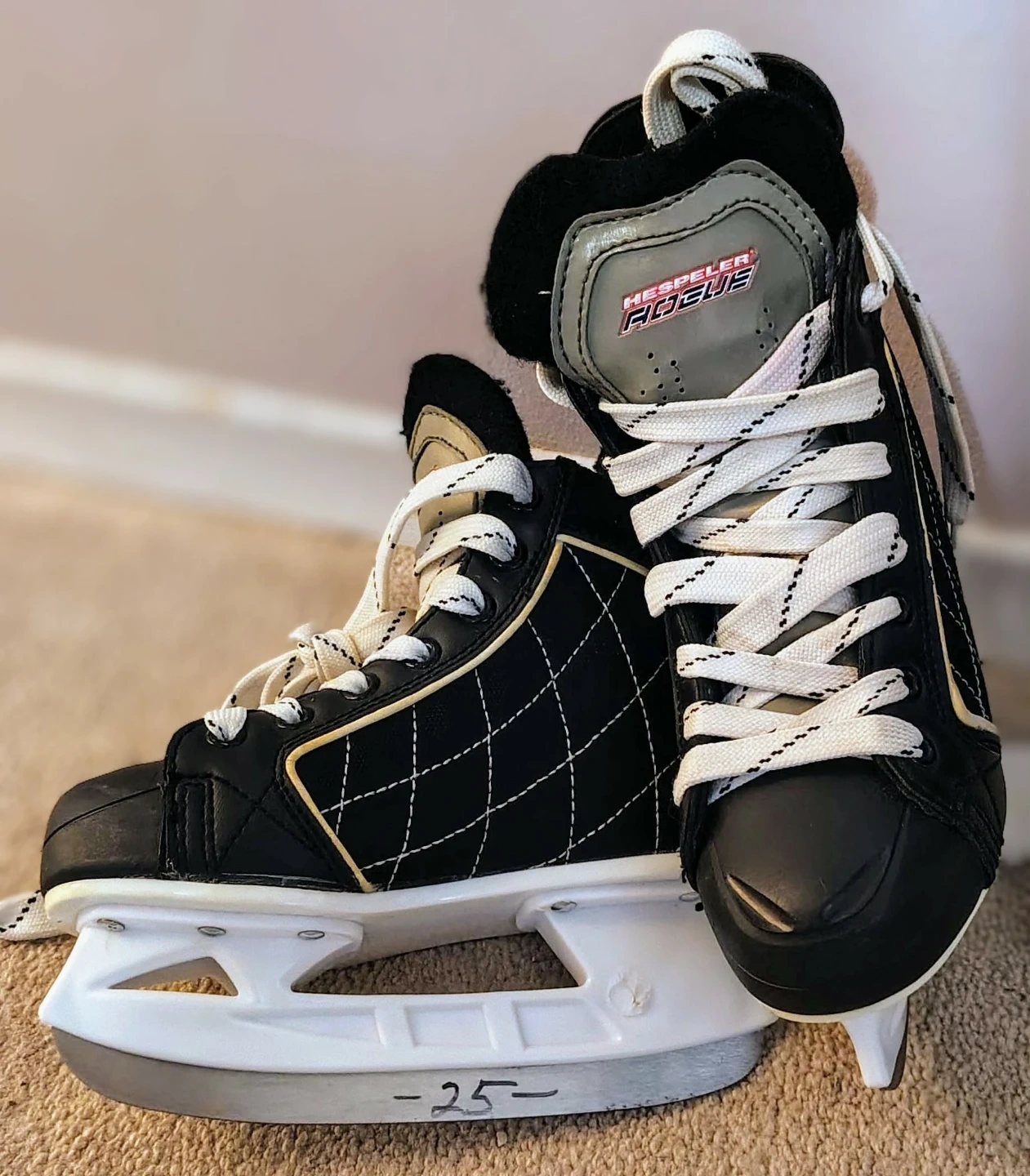 🥕 These are Hespeler Rogue ice skates in black and gold. They feature white laces and a size indication of 25 written on the blade holder. They're ready for the ice!