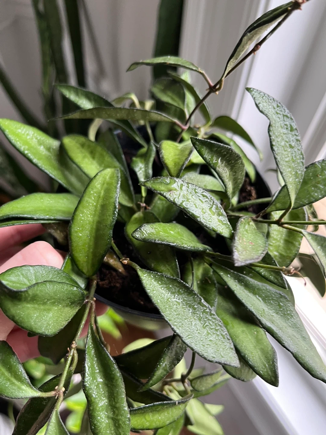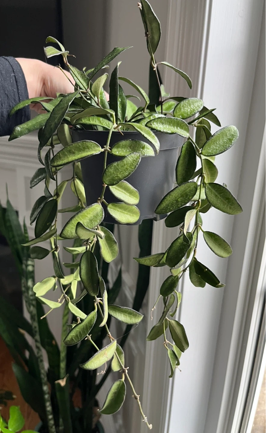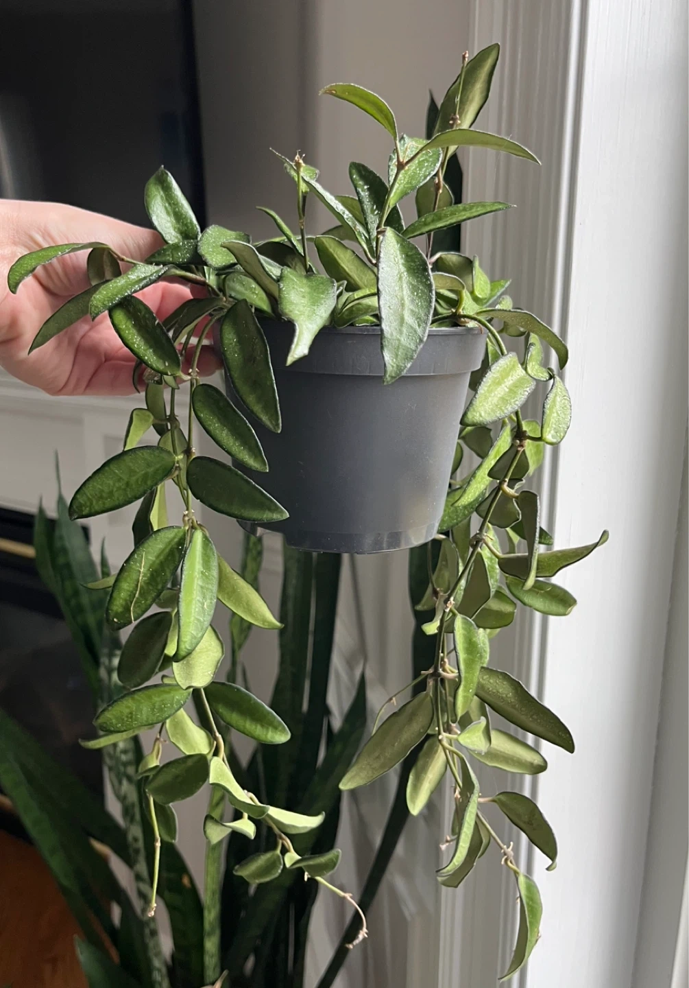 A Hoya Rosita plant with long, trailing vines and waxy leaves. It's in a simple grey plastic pot, ready to liven up any space! The plant has a healthy, bushy appearance with new growth showing.