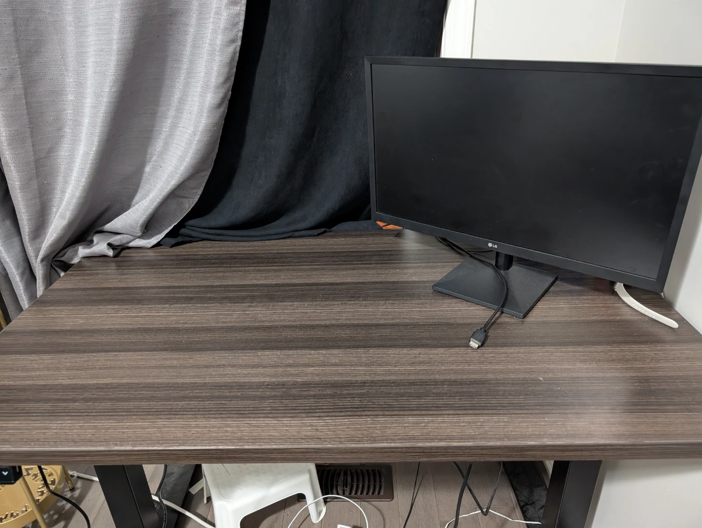 This adjustable height standing desk features a modern dark wood laminate top and a sturdy black metal frame. It includes a digital controller with memory presets for easy height adjustments. Perfect for creating a more ergonomic workspace at home or in the office!