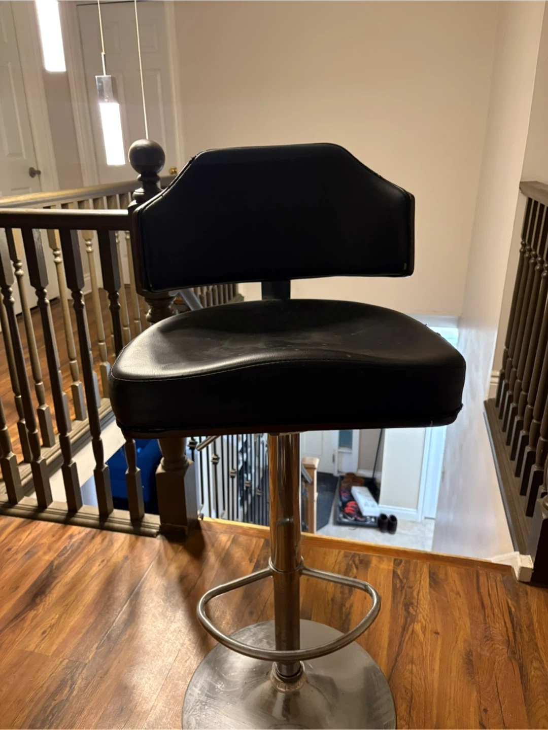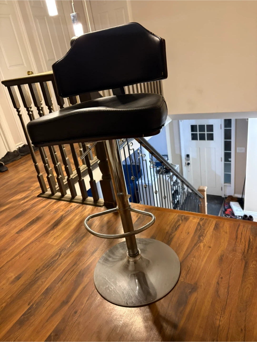 This is a black bar stool with a padded seat and backrest. It's made with faux leather upholstery and a metal base. The height is adjustable, making it suitable for various counter heights. This stool would be great for a home bar or kitchen island!