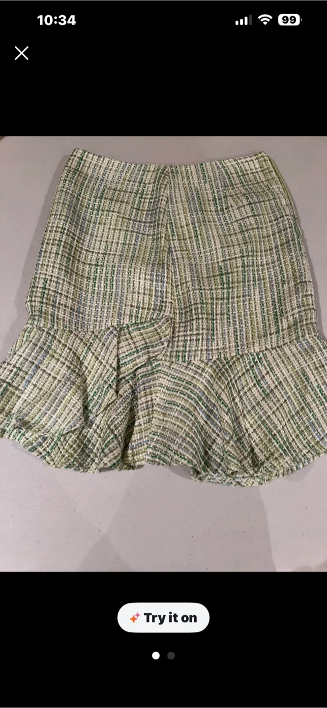This Suzy Shier tweed skirt features a green and white plaid pattern with blue accents. It has a flounced hem and a size 3/4 tag. Made in China.worn once