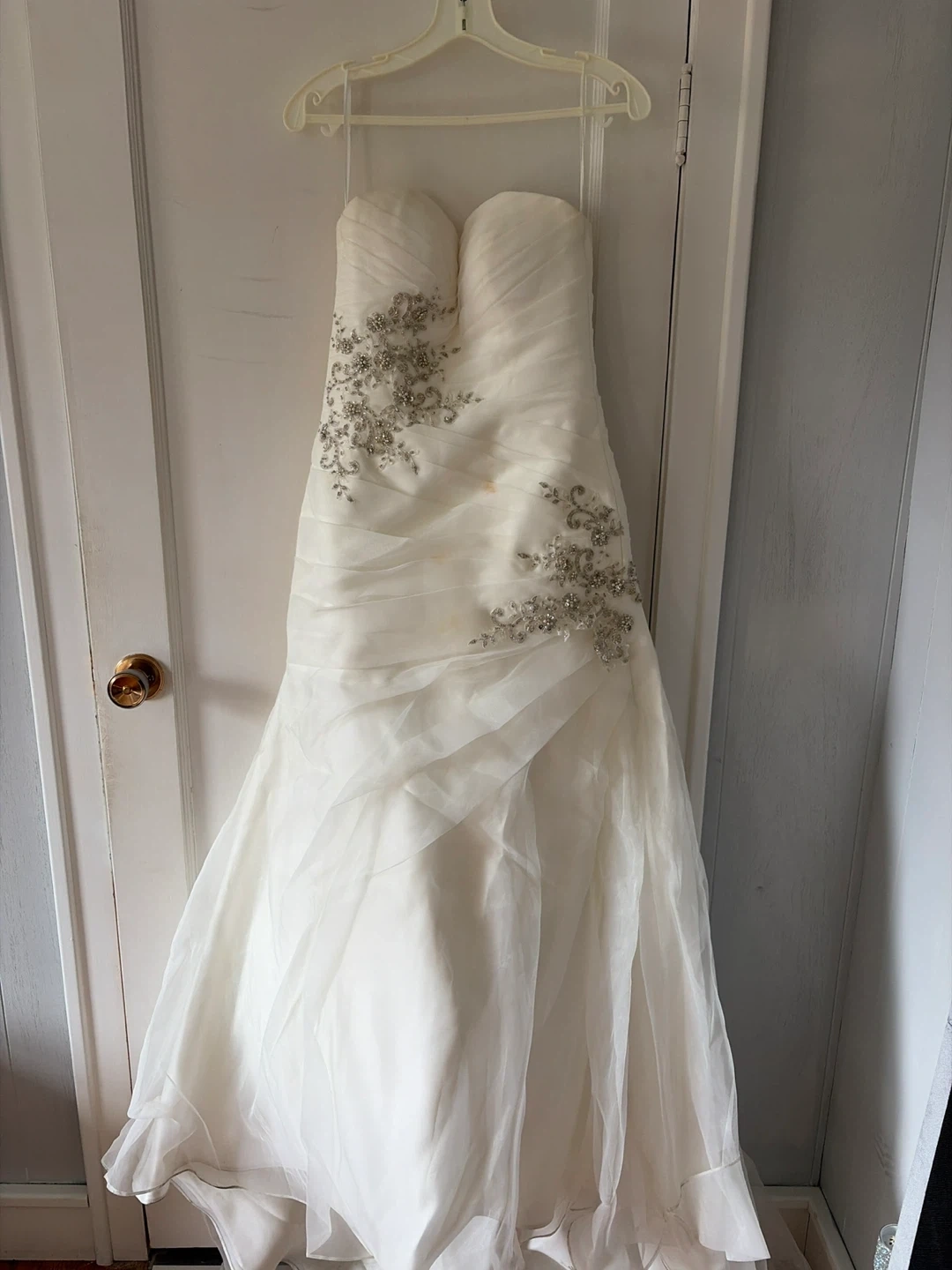 This strapless wedding dress features elegant beading on the bodice and delicate layering throughout the skirt. It has a sweetheart neckline and a mermaid silhouette. It's ready for your special day!