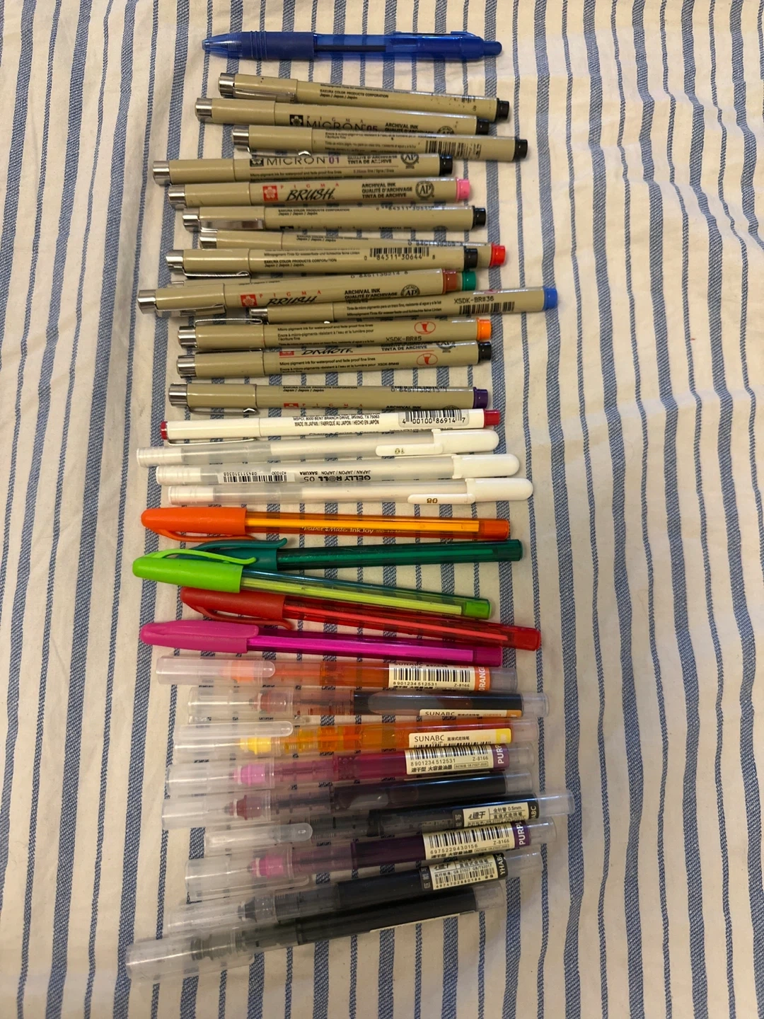 This is a collection of various pens and markers, including Micron technical pens and Sunabc gel pens. You'll find a range of colours and tip sizes for all your writing and drawing needs. These are great for artists and students alike! Like new, can test on notepad before purchase.