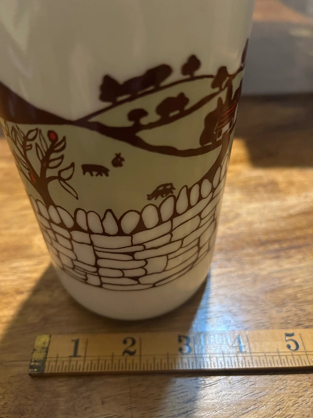 This is a white ceramic creamer jug featuring a charming brown farm scene design. It measures approximately 7 inches tall. It's perfect for serving cream or milk at your table.