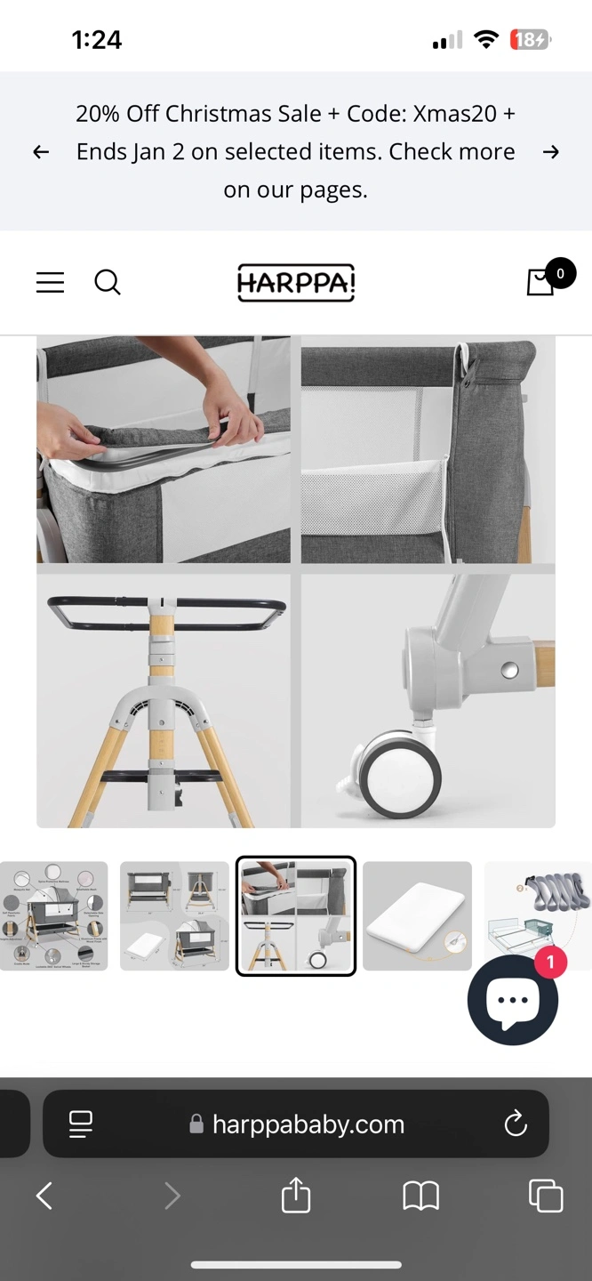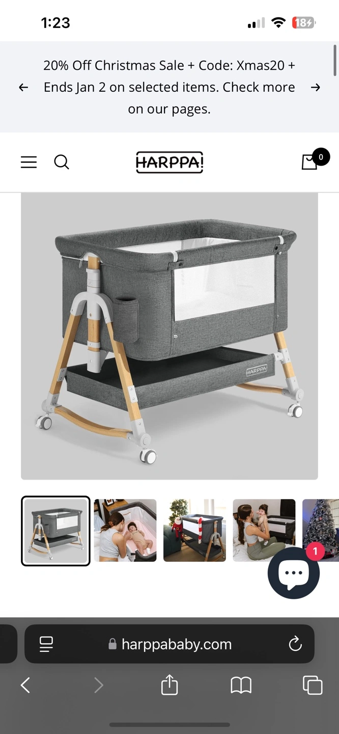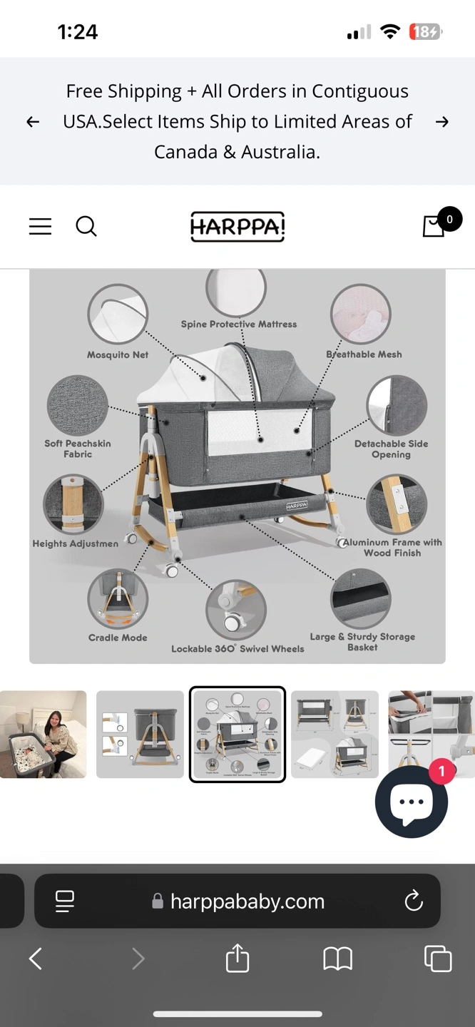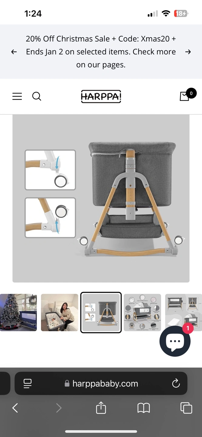 Gray fabric bassinet with wooden frame. Features rocking mode, adjustable height, 360-degree swivel wheels, and a large storage basket.