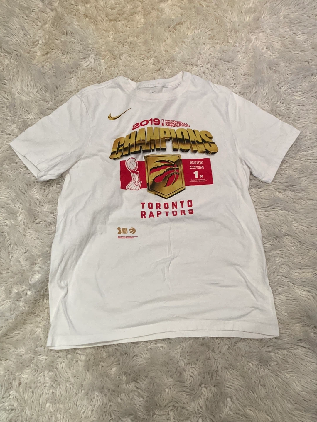 White t-shirt celebrating the Toronto Raptors' 2019 NBA Championship win. Features gold lettering and team logos. Cotton material.