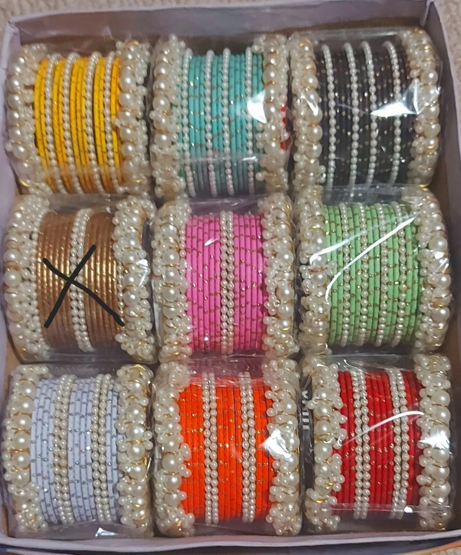 This set includes nine bangles in various colours, each adorned with white beads. They're perfect for adding a pop of colour to any outfit. Each bangle stack comes with a beaded edge.