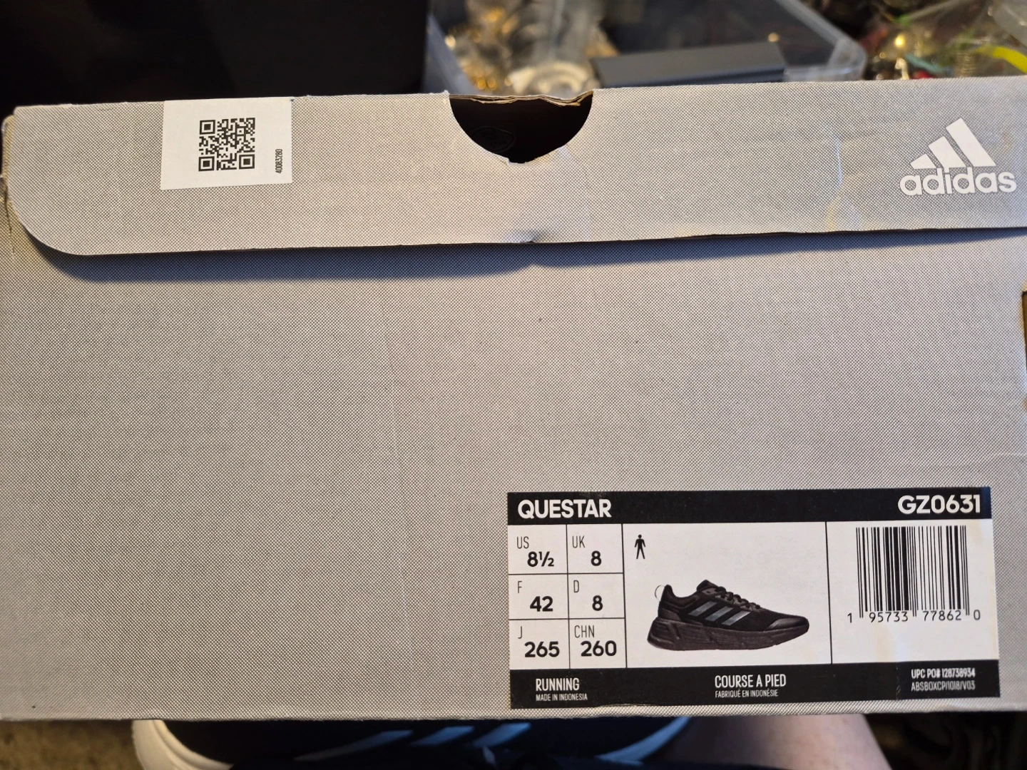 Black Adidas Questar running shoes. These shoes are size 8.5 US, 8 UK, 42 EU, and 265 J. They're designed for running and made in Indonesia.
