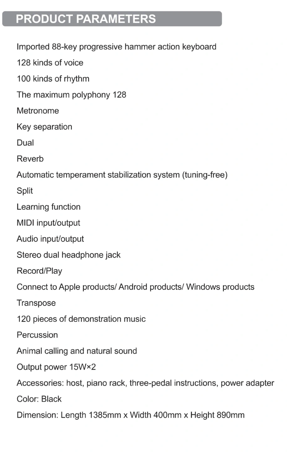 Donner 88-key progressive hammer action digital piano. It features 128 voices, 100 rhythms, and a maximum polyphony of 128. Includes MIDI input/output, audio input/output, stereo dual headphone jack, and record/play functionality. Comes with host, piano rack, three-pedal instructions, and power adapter. Color is black.