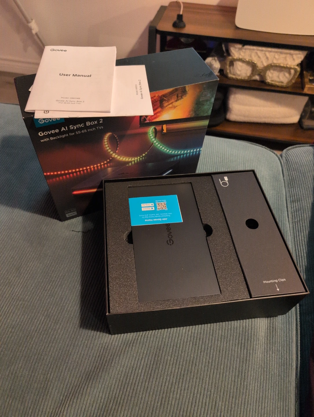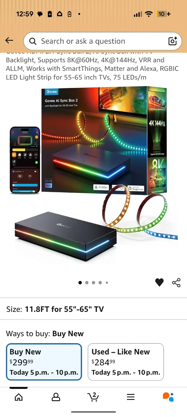 Govee AI Sync Box 2 is designed for 55-65 inch TVs. It supports 8K@60Hz and 4K@144Hz. This system works with Alexa, Google Home, and SmartThings. Includes original box and user manual.