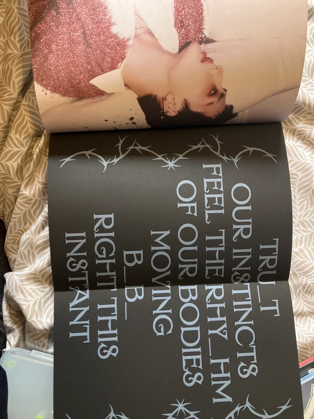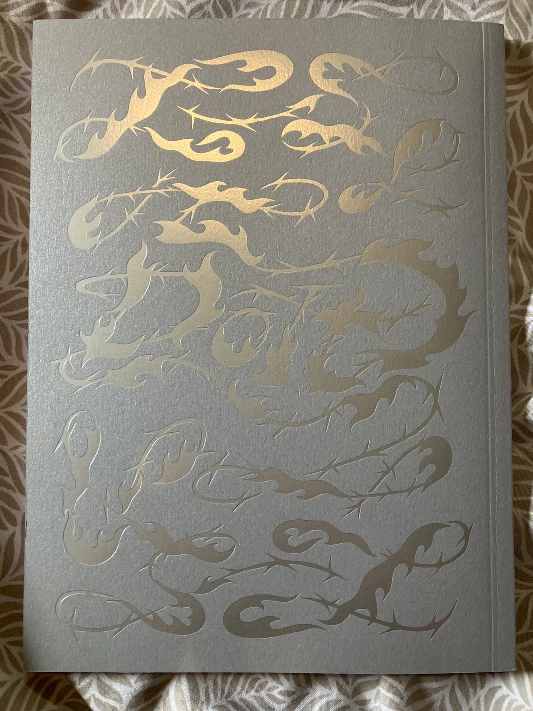 This is the SKZ-REPLAY 'SKZ-TAIPE' photo book from Stray Kids. It features a grey cover with embossed gold and silver designs. The inside pages contain artistic text and images.