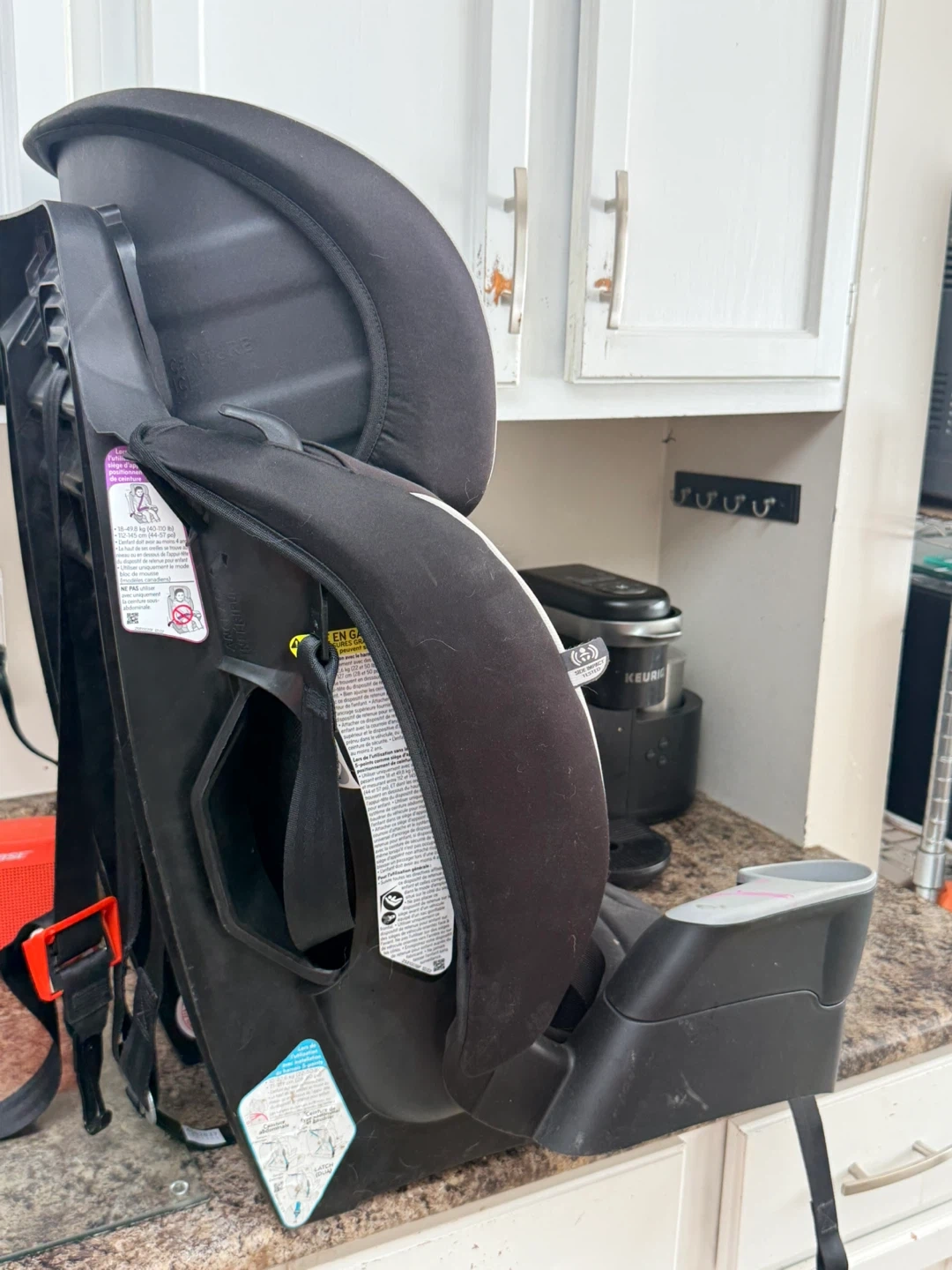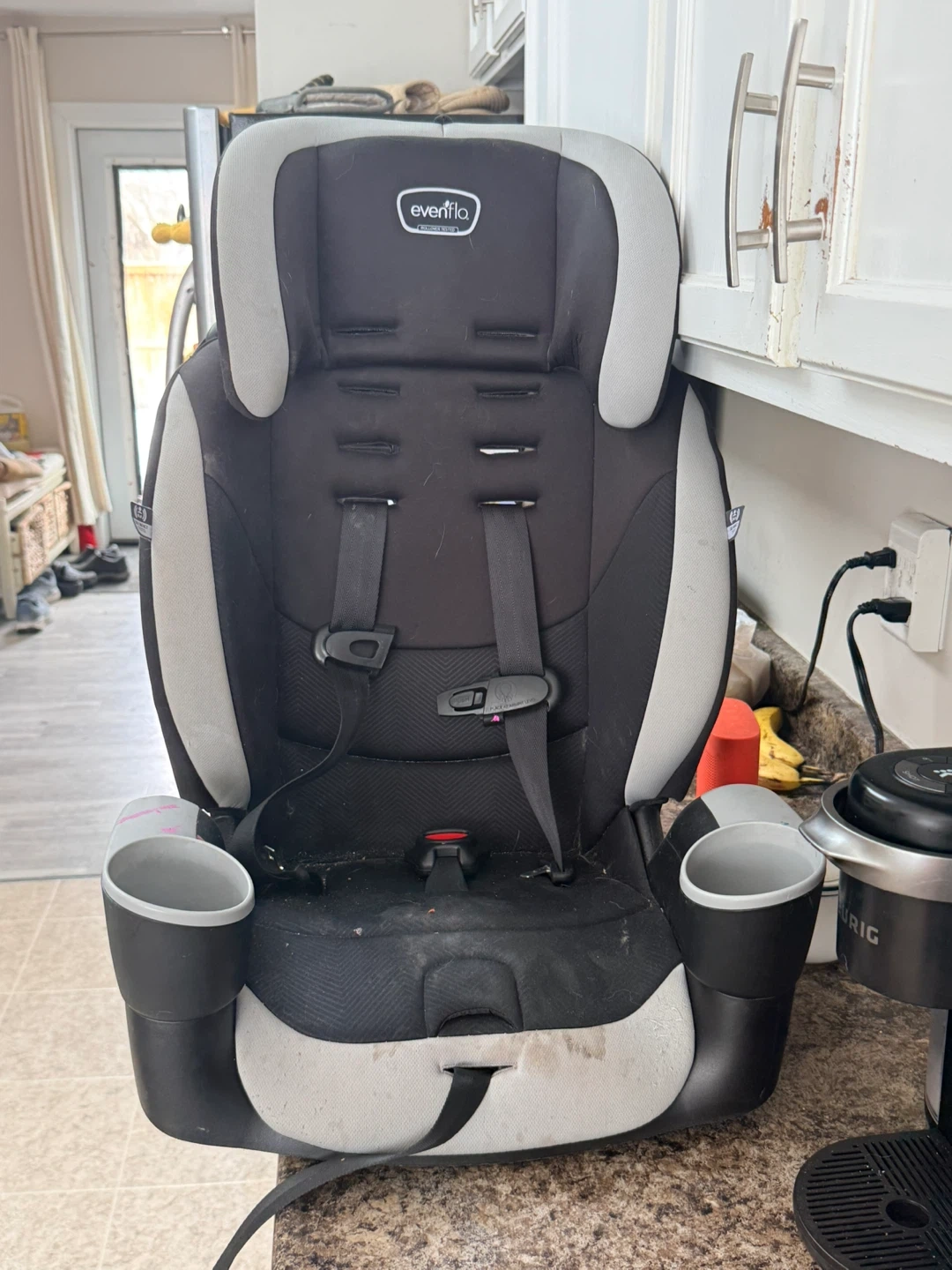 Evenflo booster car seat with two cup holders. Black and grey. It's for children's car safety. Needs a wipe down!