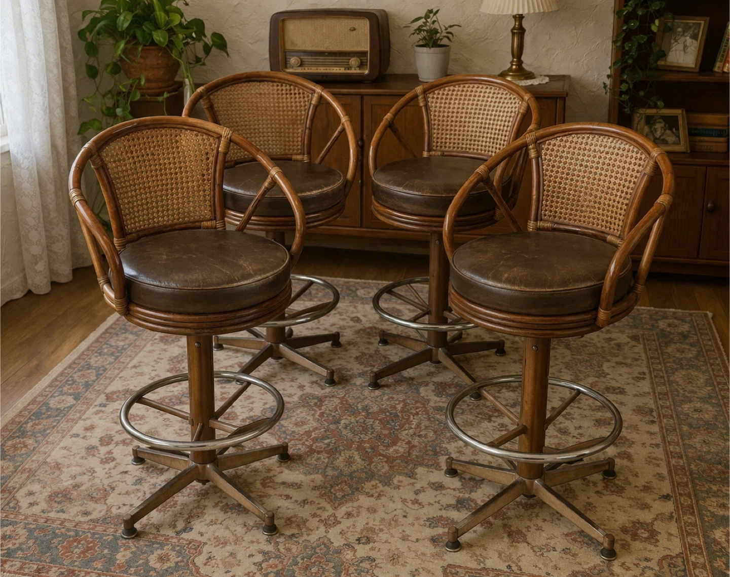 Four vintage swivel bar stools featuring a rattan back and brown faux leather seat. These chairs have a wooden frame with a metal footrest and adjustable height. They're perfect for a kitchen island or home bar setup!